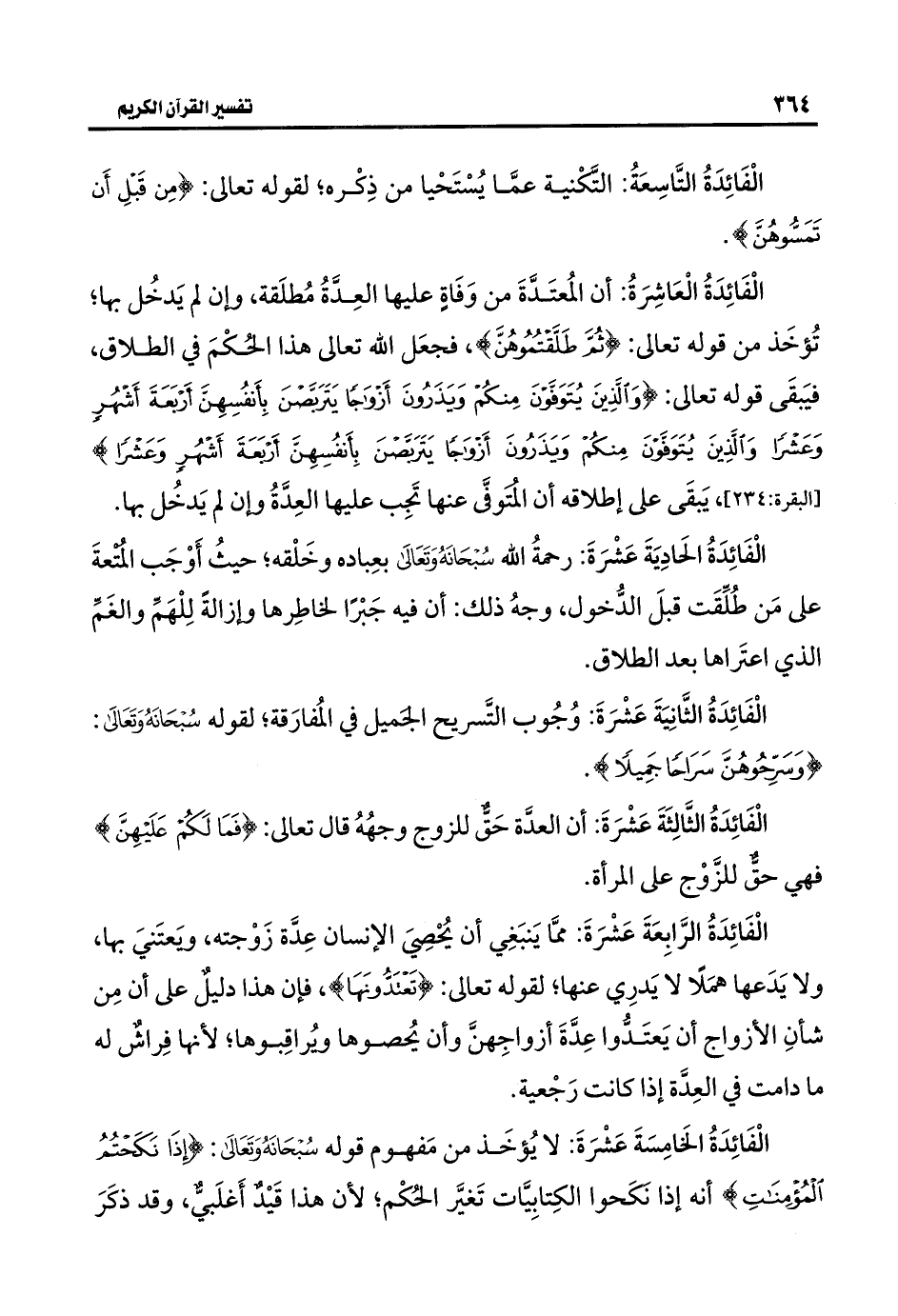 الْفَائِدَةُ الثَّانِيَةَ عَشْرَةَ: وُجُوب التَّسريح الجميل في المُفارَقة؛ لقوله سُبْحَانَهُ وَتَعَالَى: {وَسَرِّحُوهُنَّ سَرَاحًا جَمِيلًا}.