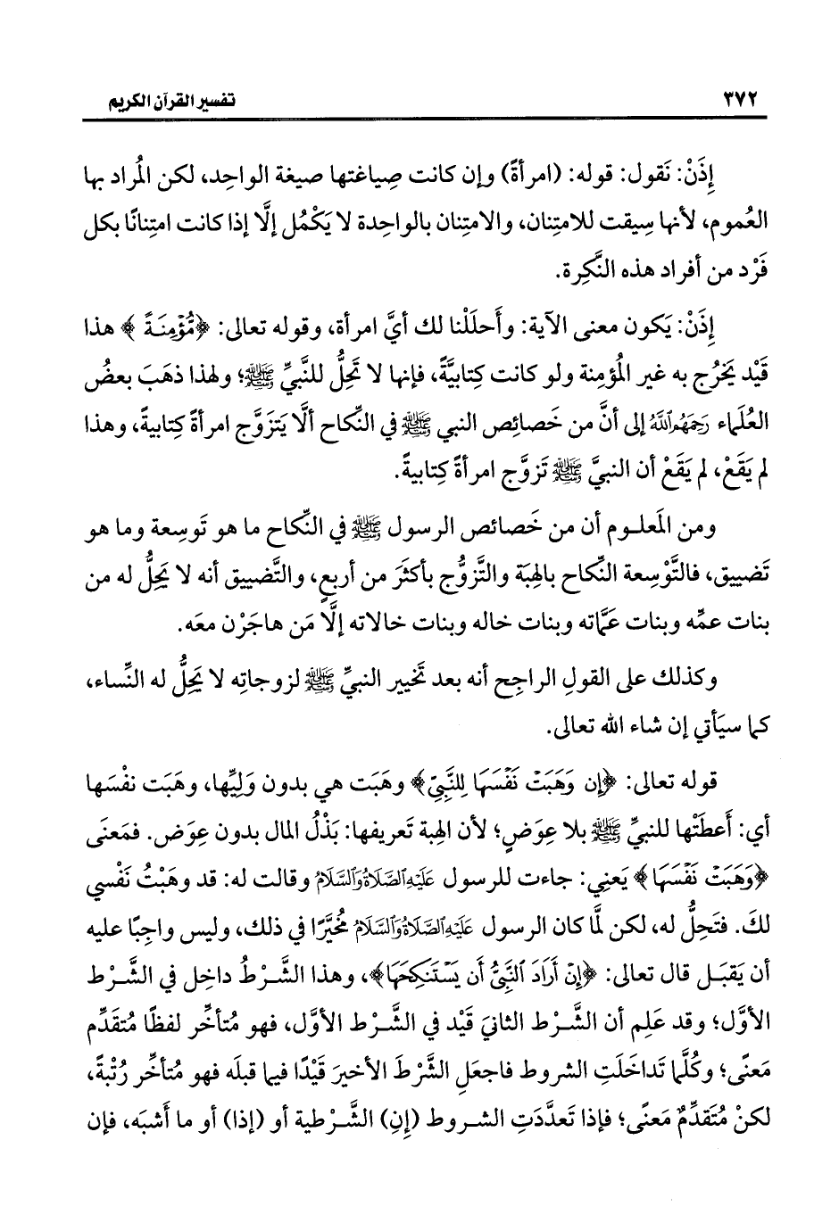 قوله تعالى: {إِنْ وَهَبَتْ نَفْسَهَا لِلنَّبِيِّ} وهَبَت هي بدون وَليِّها، وهَبَت نفْسَها أي: أَعطَتْها للنبيِّ -صلى اللَّه عليه وسلم- بلا عِوَضٍ؛ لأن الهِبة تَعريفها: بَذْلُ المال بدون عِوَض. فمَعنَى {وَهَبَتْ نَفْسَهَا} يَعنِي: جاءت للرسول عَلَيْهِ الصَّلَاةُ وَالسَّلَامُ وقالت له: قد وهَبْتُ نَفْسي لكَ. فتَحِلُّ له، لكن لمَّا كان الرسول عَلَيْهِ الصَّلَاةُ وَالسَّلَامُ مخُيَّرًا في ذلك، وليس واجِبًا عليه أن يَقبَل قال تعالى: {إِنْ أَرَادَ النَّبِيُّ أَنْ يَسْتَنْكِحَهَا}، وهذا الشَّرْطُ داخِل في الشَّرْط الأوَّل؛ وقد عَلِم أن الشَّرْط الثانيَ قَيْد في الشَّرْط الأوَّل، فهو مُتأخِّر لفظًا مُتقَدِّم مَعنًى؛ وكُلَّما تَداخَلَتِ الشروط فاجعَلِ الشَّرْطَ الأخيرَ قَيْدًا فيما قبلَه فهو مُتأخِّر رُتْبةً، لكنْ مُتَقدِّمٌ مَعنًى؛ فإذا تَعدَّدَتِ الشروط (إِنِ) الشَّرْطية أو (إذا) أو ما أَشبَه، فإن