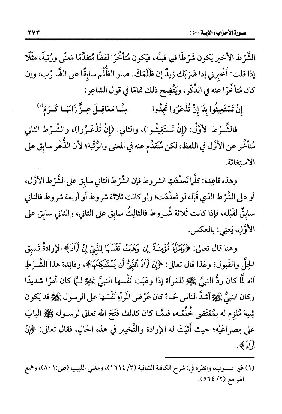 وهنا قال تعالى: {وَامْرَأَةً مُؤْمِنَةً إِنْ وَهَبَتْ نَفْسَهَا لِلنَّبِيِّ إِنْ أَرَادَ} الإرادةُ تَسبِق الحِلَّ والقَبول؛ ولهذا قال تعالى: {إِنْ أَرَادَ النَّبِيُّ أَنْ يَسْتَنْكِحَهَا}، وفائِدة هذا الشَّرْطِ أنه لمَّا كان ردُّ النبيِّ -صلى اللَّه عليه وسلم- للمَرأة إذا وهَبَت نَفْسها النبيَّ -صلى اللَّه عليه وسلم- لمَّا كان أمرًا شديدًا وكان النبيُّ -صلى اللَّه عليه وسلم- أشدَّ الناس حَياءً كان عَرْض المَرأةِ نَفْسَها على الرسول -صلى اللَّه عليه وسلم- قد يَكون شِبهَ مُلزِم له بمُقتَضى خُلُقه، فلمَّا كان كذلك فتَحَ اللَّه تعالى لرسوله -صلى اللَّه عليه وسلم- البابَ على مِصراعَيْه؛ حيث أَثبَتَ له الإرادة والتَّخيير في هذه الحالِ، فقال تعالى: {إِنْ أَرَادَ}.