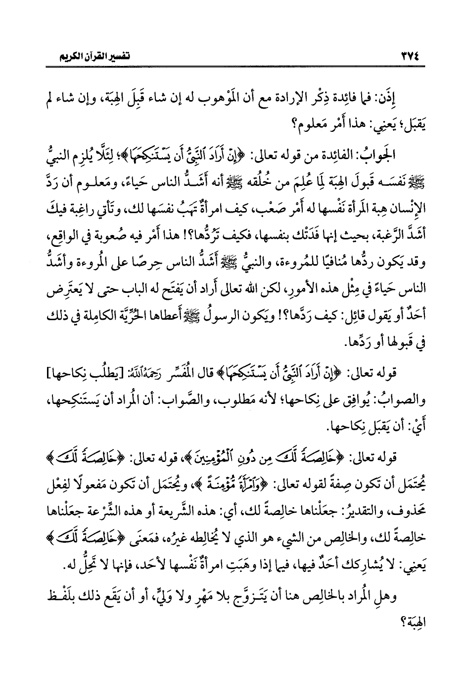 قوله تعالى: {خَالِصَةً لَكَ مِنْ دُونِ الْمُؤْمِنِينَ}، قوله تعالى: {خَالِصَةً لَكَ} يُحتَمَل أن تَكون صِفةً لقوله تعالى: {وَامْرَأَةً مُؤْمِنَةً}، ويُحتَمَل أن تَكون مَفعولًا لفِعْل محَذوف، والتقديرُ: جعَلْناها خالِصةً لك، أي: هذه الشَّريعة أو هذه الشِّرْعة جعَلْناها خالِصةً لك، والخالِص من الشيء هو الذي لا يُخالِطه غيرُه، فمَعنَى {خَالِصَةً لَكَ} يَعنِي: لا يُشارِكك أحَدٌ فيها، فيما إذا وهَبَتِ امرأةٌ نَفْسها لأحَد، فإنها لا تَحِلُّ له.