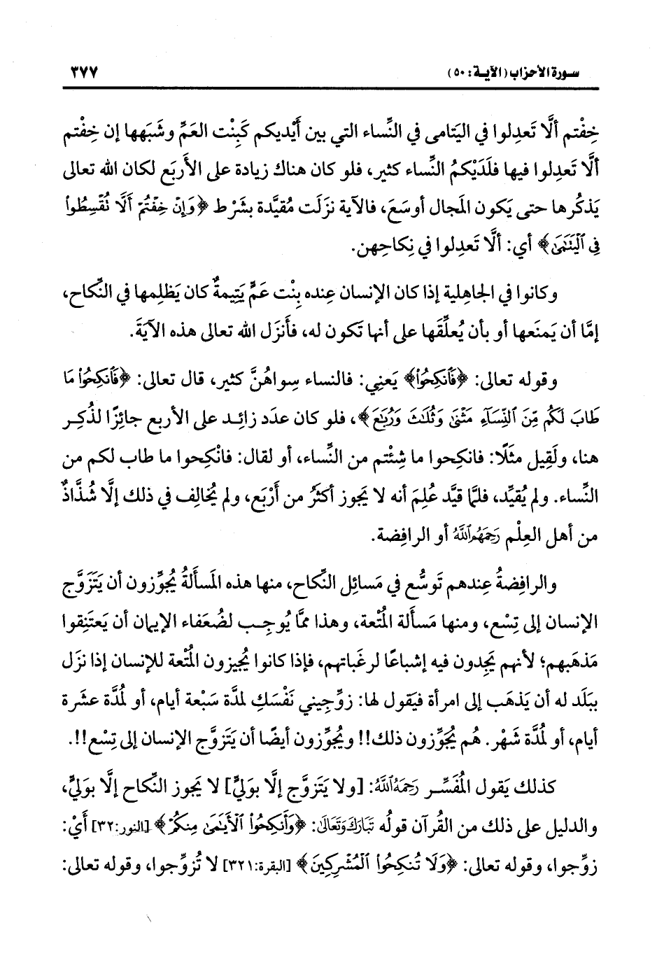 كذلك يَقول المُفَسِّر رَحِمَهُ اللَّهُ: [ولا يَتَزوَّج إلَّا بوَليٍّ] لا يَجوز النِّكاح إلَّا بوَليٍّ، والدليل على ذلك من القُرآن قولُه تَبَارَكَ وَتَعَالَى: {وَأَنْكِحُوا الْأَيَامَى مِنْكُمْ} [النور: ٣٢] أَيْ: زوِّجوا، وقوله تعالى: {وَلَا تُنْكِحُوا الْمُشْرِكِينَ} [البقرة: ٢٢١] لا تُزوِّجوا، وقوله تعالى: