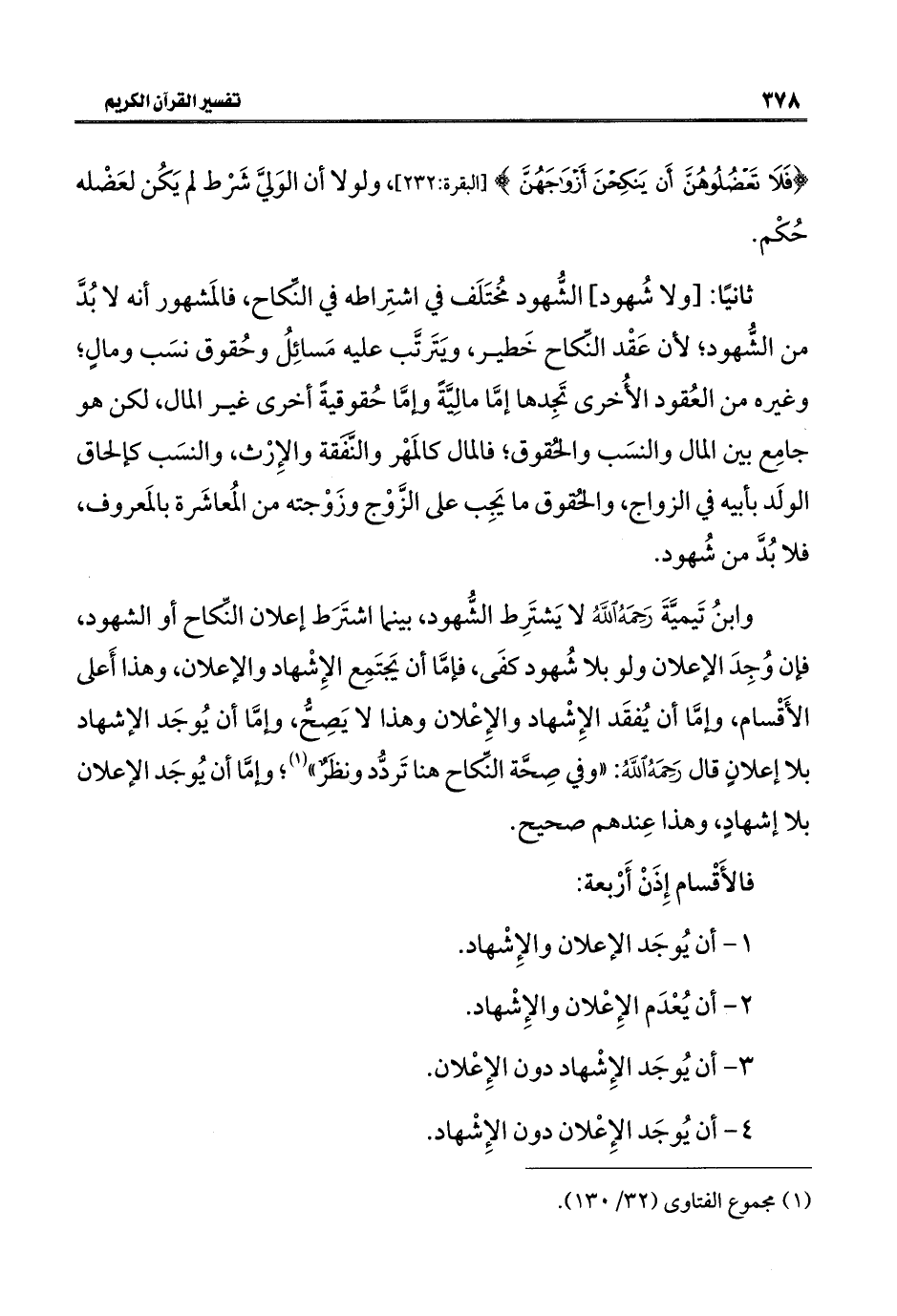 وابنُ تَيميَّةَ رَحِمَهُ اللَّهُ لا يَشتَرِط الشُّهود، بينما اشتَرَط إعلان النِّكاح أو الشهود، فإن وُجِدَ الإعلان ولو بلا شُهود كفَى، فإمَّا أن يَجتَمِع الإِشْهاد والإعلان، وهذا أَعلى الأَقْسام، وإمَّا أن يُفقَد الإِشْهاد والإعْلان وهذا لا يَصِحُّ، وإمَّا أن يُوجَد الإشهاد بلا إعلانٍ قال رَحِمَهُ اللَّهُ: "وفي صِحَّة النِّكاح هنا تَردُّد ونظَرٌ" (¬١)؛ وإمَّا أن يُوجَد الإعلان بلا إشهادٍ، وهذا عِندهم صحيح.