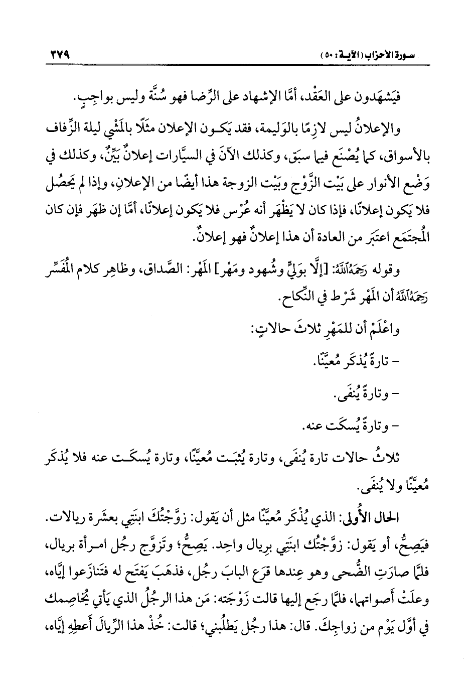 الحال الأُولى: الذي يُذْكَر مُعيَّنًا مثل أن يَقول: زوَّجْتُكَ ابنَتِي بعشَرة ريالات. فيَصِحُّ، أو يَقول: زوَّجْتُك ابنَتِي برِيال واحِد. يَصِحُّ؛ وتَزوَّج رجُل امرأة بريال، فلمَّا صارَتِ الضُّحى وهو عِندها قرَع البابَ رجُل، فذهَبَ يَفتَح له فتَنازَعوا إيَّاه، وعلَتْ أَصواتهما، فلمَّا رجَع إليها قالت زَوْجَته: مَن هذا الرجُلُ الذي يَأتي يُخاصِمك في أوَّل يَوْم من زواجِكَ. قال: هذا رجُل يَطلُبني؛ قالت: خُذْ هذا الرِّيالَ أَعطِهِ إيَّاه،