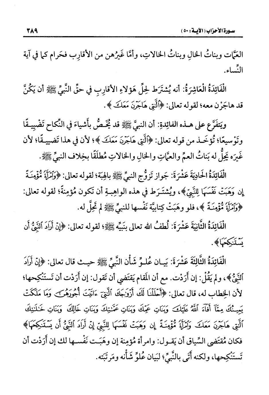 الْفَائِدَةُ الثَّالِثَةَ عَشْرَةَ: بَيان عُلوِّ شَأْن النَّبيِّ -صلى اللَّه عليه وسلم- حيث قال تعالى: {إِنْ أَرَادَ النَّبِيُّ}، ولم يَقُلْ: إن أَرَدْت. مع أن المَقام يَقتَضي أن تَقول: إن أَرَدْت أن تَستَنْكِحها؛ لأن الخِطاب له، قال تعالى: {أَحْلَلْنَا لَكَ أَزْوَاجَكَ اللَّاتِي آتَيْتَ أُجُورَهُنَّ وَمَا مَلَكَتْ يَمِينُكَ مِمَّا أَفَاءَ اللَّهُ عَلَيْكَ وَبَنَاتِ عَمِّكَ وَبَنَاتِ عَمَّاتِكَ وَبَنَاتِ خَالِكَ وَبَنَاتِ خَالَاتِكَ اللَّاتِي هَاجَرْنَ مَعَكَ وَامْرَأَةً مُؤْمِنَةً إِنْ وَهَبَتْ نَفْسَهَا لِلنَّبِيِّ إِنْ أَرَادَ النَّبِيُّ أَنْ يَسْتَنْكِحَهَا} فكان مُقتَضى السِّياق أن يَقول: وامرأة مُؤمِنة إن وهَبَت نَفْسها لك إن أَرَدْت أن تَستَنْكِحها، ولكنه أَتَى بالنَّبيِّ؛ لبَيان عُلوِّ شَأْنه ومَرتَبَته.