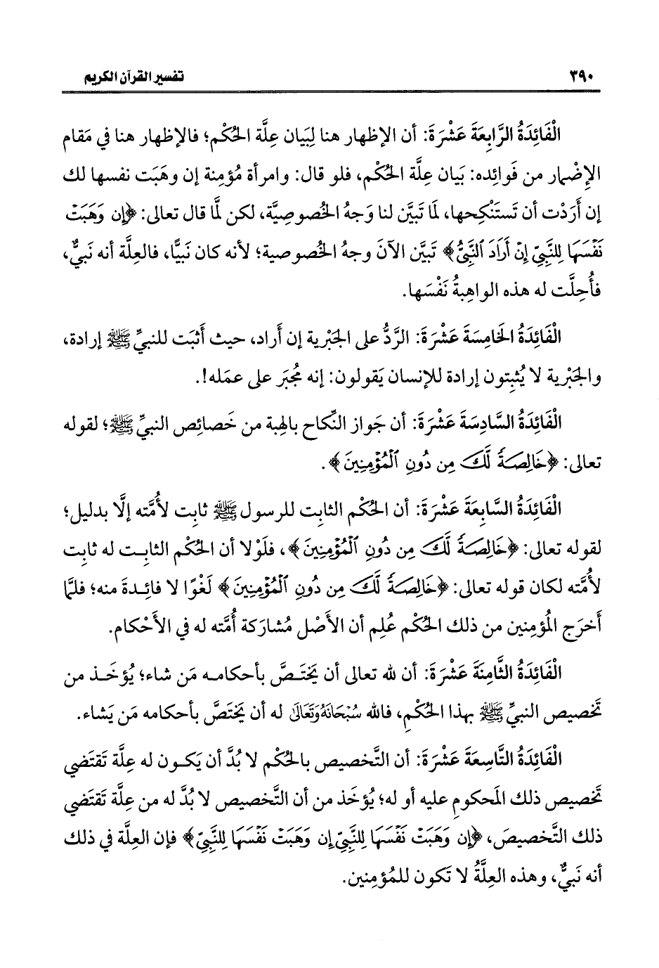 الْفَائِدَةُ التَّاسِعَةَ عَشْرَةَ: أن التَّخصيص بالحُكْم لابُدَّ أن يَكون له عِلَّة تَقتَضي تَخصيص ذلك المَحكومِ عليه أو له؛ يُؤخَذ من أن التَّخصيص لابُدَّ له من عِلَّة تَقتَضي ذلك التَّخصيصَ، {إِنْ وَهَبَتْ نَفْسَهَا لِلنَّبِيِّ} فإن العِلَّة في ذلك أنه نَبيٌّ، وهذه العِلَّةُ لا تَكون للمُؤمِنين.