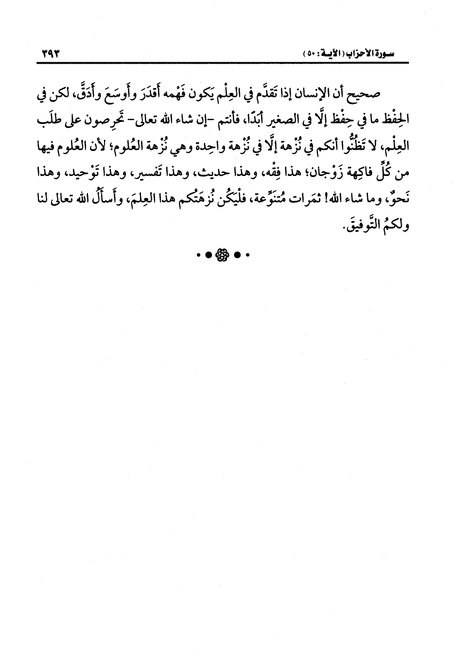 صحيح أن الإنسان إذا تَقدَّم في العِلْم يَكون فَهْمه أَقدَرَ وأَوسَعَ وأَدَقَّ، لكن في الحِفْظ ما في حِفْظ إلَّا في الصغير أبَدًا، فأنتم -إن شاء اللَّه تعالى- تَحرِصون على طلَب العِلْم، لا تَظُنُّوا أنكم في نُزْهة إلَّا في نُزْهة واحِدة وهي نُزْهة العُلوم؛ لأن العُلوم فيها من كُلِّ فاكِهة زَوْجان؛ هذا فِقْه، وهذا حديث، وهذا تَفسير، وهذا تَوْحيد، وهذا نَحوٌ، وما شاء اللَّه! ثمَرات مُتنَوِّعة، فلْيَكُن نُزهَتُكم هذا العِلمَ، وأَسأَلُ اللَّه تعالى لنا ولكمُ التَّوفيقَ.