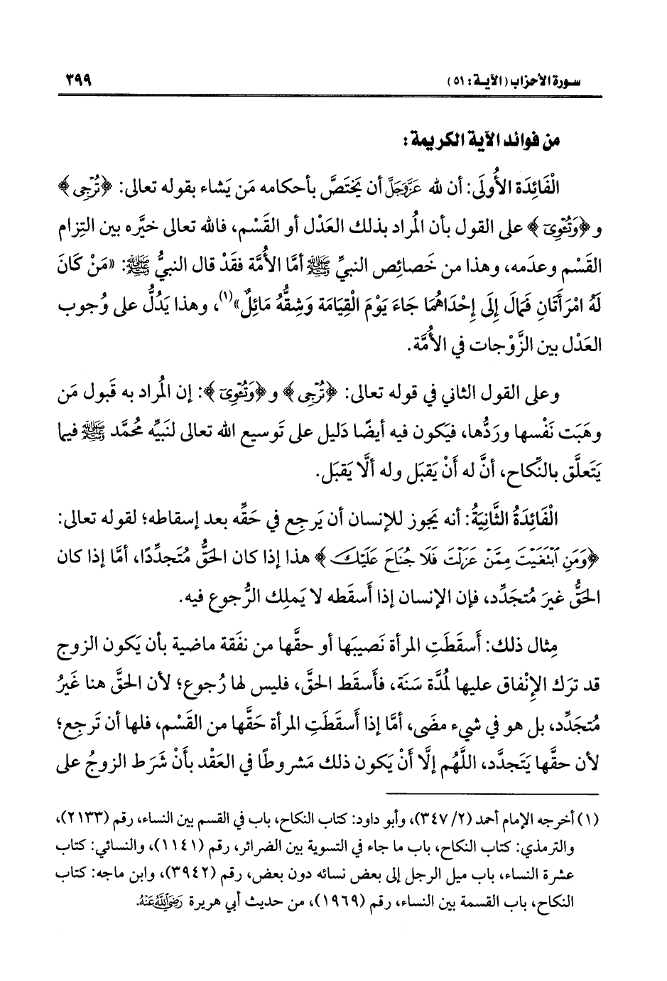 الْفَائِدَة الأُولَى: أن للَّه عَزَّ وَجَلَّ أن يَختَصَّ بأحكامه مَن يَشاء بقوله تعالى: {تُرْجِي} و {وَتُؤْوِي} على القول بأن المُراد بذلك العَدْل أو القَسْم، فاللَّه تعالى خيَّره بين التِزام القَسْم وعدَمه، وهذا من خَصائِص النبيِّ -صلى اللَّه عليه وسلم- أمَّا الأُمَّة فقَدْ قال النبيُّ -صلى اللَّه عليه وسلم-: "مَنْ كَانَ لَهُ امْرَأَتَانِ فَمَالَ إِلَى إِحْدَاهُمَا جَاءَ يَوْمَ الْقِيَامَة وَشِقُّهُ مَائِلٌ" (¬١)، وهذا يَدُلُّ على وُجوب العَدْل بين الزَّوْجات في الأُمَّة.