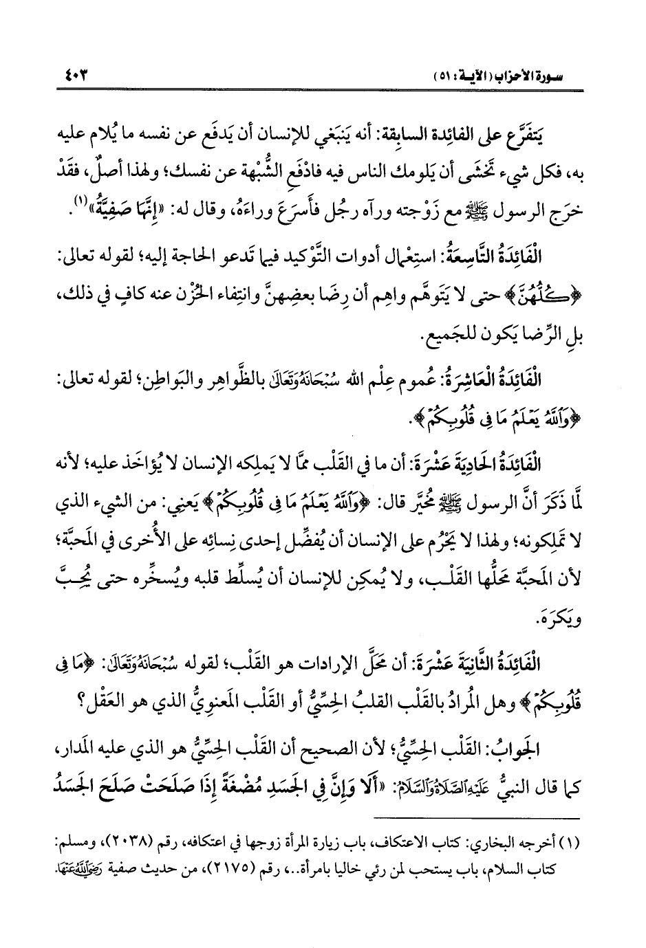 الْفَائِدَةُ الحَادِيَةَ عَشْرَةَ: أن ما في القَلْب ممَّا لا يَملِكه الإنسان لا يُؤاخَذ عليه؛ لأنه لمَّا ذَكَرَ أنَّ الرسول -صلى اللَّه عليه وسلم- مخُيَّر قال: {وَاللَّهُ يَعْلَمُ مَا فِي قُلُوبِكُمْ} يَعنِي: من الشيء الذي لا تمَلِكونه؛ ولهذا لا يَحْرُم على الإنسان أن يُفضِّل إحدى نِسائِه على الأُخرى في المَحبَّة؛ لأن المَحبَّة محَلُّها القَلْب، ولا يُمكِن للإنسان أن يُسلِّط قلبه ويُسخِّره حتى يُحِبَّ وَيَكرَهَ.