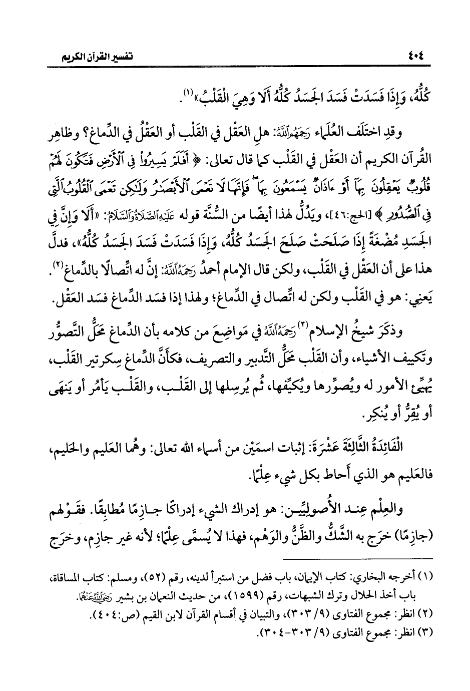 وقدِ اختَلَف العُلَماء رَحِمَهُ اللَّهُ: هلِ العَقْل في القَلْب أو العَقْلُ في الدِّماغ؟ وظاهِر القُرآن الكريم أن العَقْل في القَلْب كما قال تعالى: {أَفَلَمْ يَسِيرُوا فِي الْأَرْضِ فَتَكُونَ لَهُمْ قُلُوبٌ يَعْقِلُونَ بِهَا أَوْ آذَانٌ يَسْمَعُونَ بِهَا فَإِنَّهَا لَا تَعْمَى الْأَبْصَارُ وَلَكِنْ تَعْمَى الْقُلُوبُ الَّتِي فِي الصُّدُورِ} [الحج: ٤٦]، ويَدُلُّ لهذا أيضًا من السُّنَّة قوله عَلَيْهَ الصَّلَاةُ وَالسَّلَامُ: "أَلَا وَإِنَّ فِي الجَسَدِ مُضْغَةً إِذَا صَلَحَتْ صَلَحَ الجَسَدُ كلُّهُ، وَإِذَا فَسَدَتْ فَسَدَ الجَسَدُ كلُّهُ"، فدلَّ هذا على أن العَقْل في القَلْب، ولكن قال الإمام أحمدُ رَحِمَهُ اللَّهُ: إنَّ له اتِّصالًا بالدِّماغ (¬٢). يَعنِي: هو في القَلْب ولكن له اتِّصال في الدِّماغ؛ ولهذا إذا فسَد الدِّماغ فسَد العَقْل.