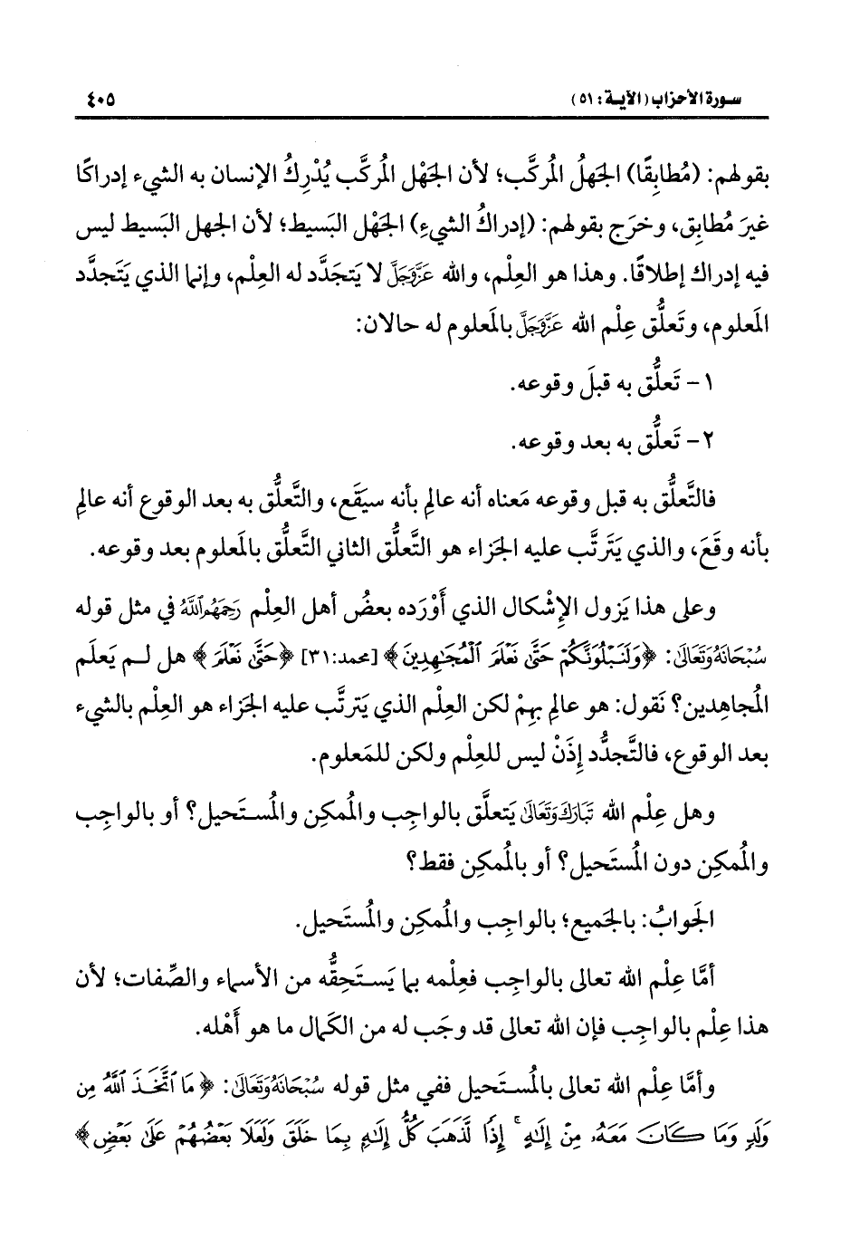 وعلى هذا يَزول الإِشْكال الذي أَوْرَده بعضُ أهل العِلْم رَحِمَهُم اللَّهُ في مثل قوله سُبْحَانَهُ وَتَعَالَى: {وَلَنَبْلُوَنَّكُمْ حَتَّى نَعْلَمَ الْمُجَاهِدِينَ} [محمد: ٣١] {حَتَّى نَعْلَمَ} هل لم يَعلَم المُجاهِدين؟ نَقول: هو عالِم بهِمْ لكن العِلْم الذي يَترتَّب عليه الجَزاء هو العِلْم بالشيء بعد الوقوع، فالتَّجدُّد إِذَنْ ليس للعِلْم ولكن للمَعلوم.