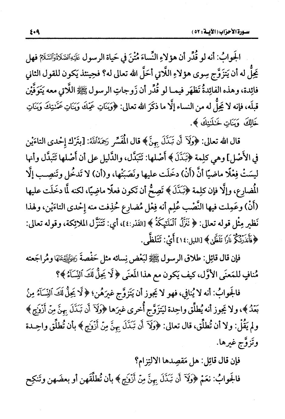 فالجَوابُ: أنه لا يُنافِي، فهو لا يَجوز أن يَتَزوَّج غيرَهُن؛ {لَا يَحِلُّ لَكَ النِّسَاءُ مِنْ بَعْدُ}، ولا يَجوز أنه يُطلِّق واحِدة ليَتزَوَّج أُخرى غيرَها {وَلَا أَنْ تَبَدَّلَ بِهِنَّ مِنْ أَزْوَاجٍ} ولم يَقُلْ: ولا أن تُطلِّق، قال تعالى: {وَلَا أَنْ تَبَدَّلَ بِهِنَّ مِنْ أَزْوَاجٍ} بأن تُطلِّق واحِدة وتَزوَّج غيرها.