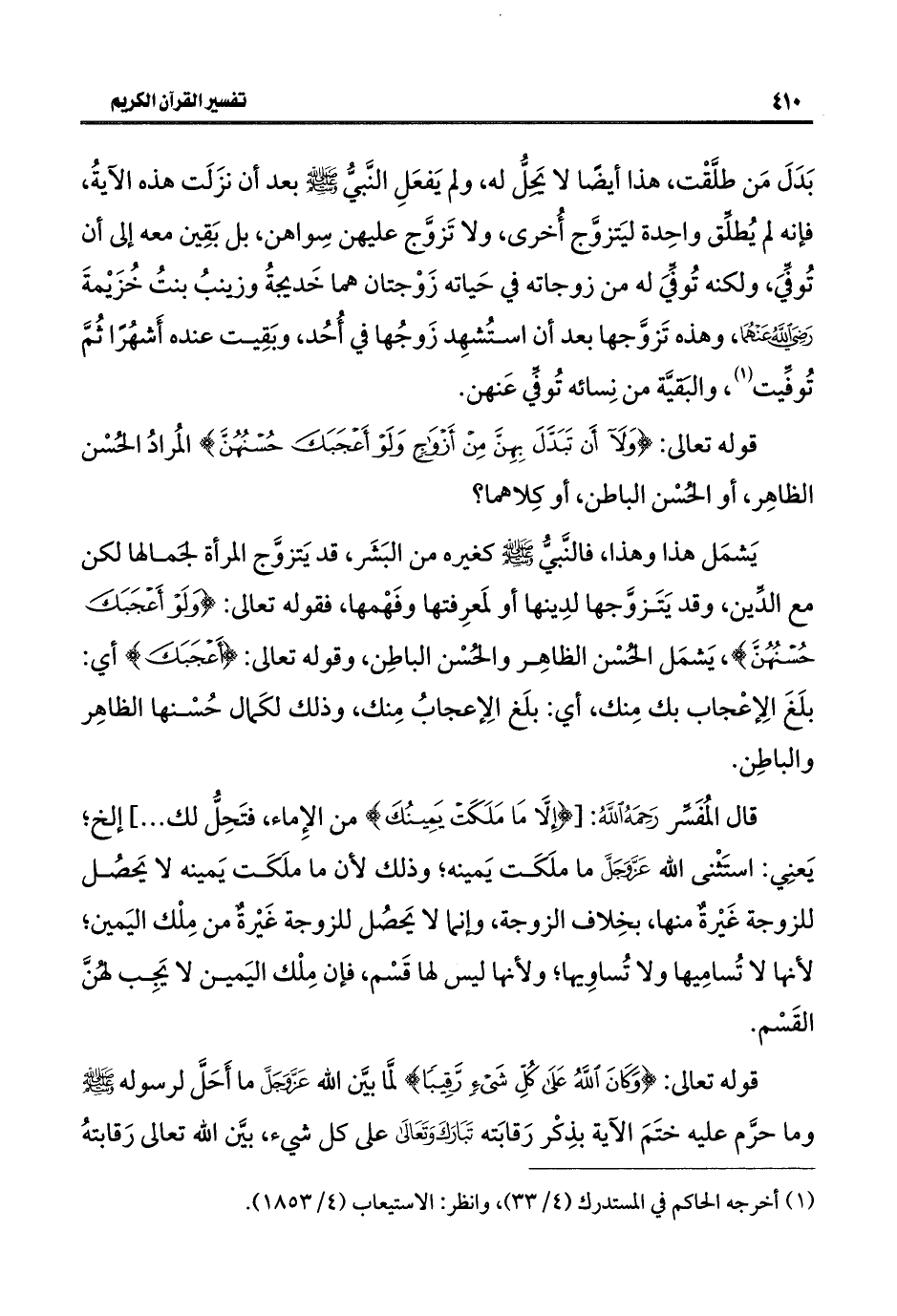 قال المُفَسِّر رَحِمَهُ اللَّهُ: [{إِلَّا مَا مَلَكَتْ يَمِينُكَ} من الإِماء، فتَحِلُّ لك. . .] إلخ؛ يَعنِي: استَثْنى اللَّه عَزَّ وَجَلَّ ما ملَكَت يَمينه؛ وذلك لأن ما ملَكَت يَمينه لا يَحصُل للزوجة غَيْرةٌ منها، بخِلاف الزوجة، وإنما لا يَحصُل للزوجة غَيْرةٌ من مِلْك اليَمين؛ لأنها لا تُسامِيها ولا تُساوِيها؛ ولأنها ليس لها قَسْم، فإن مِلْك اليَمين لا يَجِب لهُنَّ القَسْم.