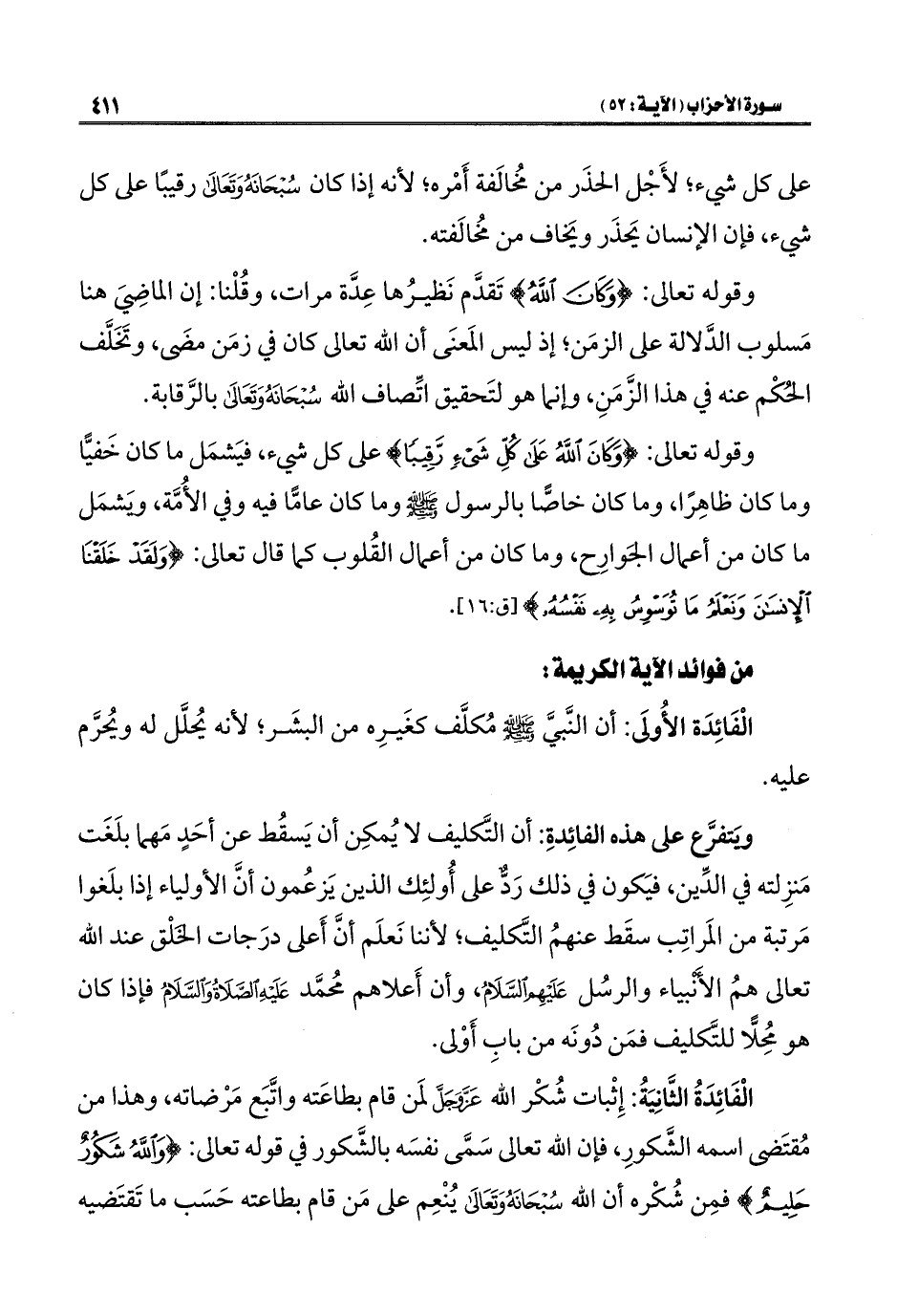 ويَتفرَّع على هذه الفائِدةِ: أن التَّكليف لا يُمكِن أن يَسقُط عن أحَدٍ مَهما بلَغَت مَنزِلته في الدِّين، فيَكون في ذلك رَدٌّ على أُولئِك الذين يَزعُمون أنَّ الأولياء إذا بلَغوا مَرتبة من المَراتِب سقَط عنهمُ التَّكليف؛ لأننا نَعلَم أنَّ أَعلى درَجات الخَلْق عند اللَّه تعالى همُ الأَنْبياء والرسُل عَلَيْهِ السَّلَامُ، وأن أَعلاهم محُمَّد عَلَيْهَ الصَّلَاةُ وَالسَّلَامُ فإذا كان هو محُلًّا للتَّكَليف فمَن دُونَه من بابِ أَوْلى.