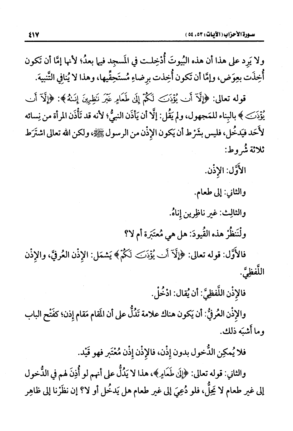 قوله تعالى: {إِلَّا أَنْ يُؤْذَنَ لَكُمْ إِلَى طَعَامٍ غَيْرَ نَاظِرِينَ إِنَاهُ}: {إِلَّا أَنْ يُؤْذَنَ} بالبِناء للمَجهول، ولم يَقُل: إلَّا أن يَأذَن النبيُّ؛ لأنه قد تَأْذَن المرأة من نِسائه لأَحَد فيَدخُل، فليس بشَرْط أن يَكون الإِذْن من الرسول -صلى اللَّه عليه وسلم-، ولكن اللَّه تعالى اشتَرَط ثلاثة شُروط: