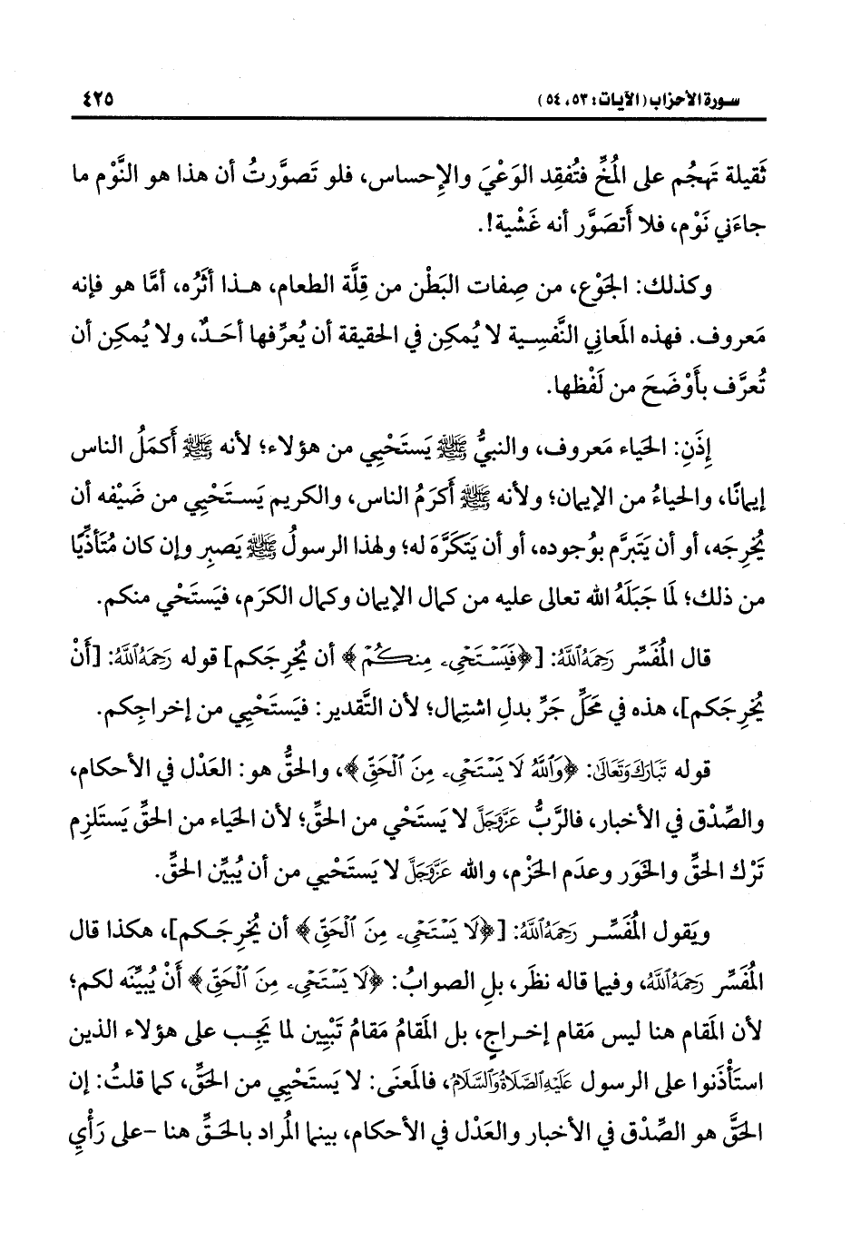 ويَقول المُفَسِّر رَحِمَهُ اللَّهُ: [{لَا يَسْتَحْيِي مِنَ الْحَقِّ} أن يُخرِجَكم]، هكذا قال المُفَسِّر رَحِمَهُ اللَّهُ، وفيما قاله نظَر، بلِ الصوابُ: {لَا يَسْتَحْيِي مِنَ الْحَقِّ} أَنْ يُبيِّنَه لكم؛ لأن المَقام هنا ليس مَقام إخراجٍ، بل المَقامُ مَقامُ تَبْيِين لما يَجِب على هؤلاء الذين استَأْذَنوا على الرسول عَلَيْهِ الصَّلَاةُ وَالسَّلَامُ، فالمَعنَى: لا يَستَحْيِي من الحَقِّ، كما قلتُ: إن الحَقَّ هو الصِّدْق في الأخبار والعَدْل في الأحكام، بينما المُراد بالحَقِّ هنا -على رَأْي