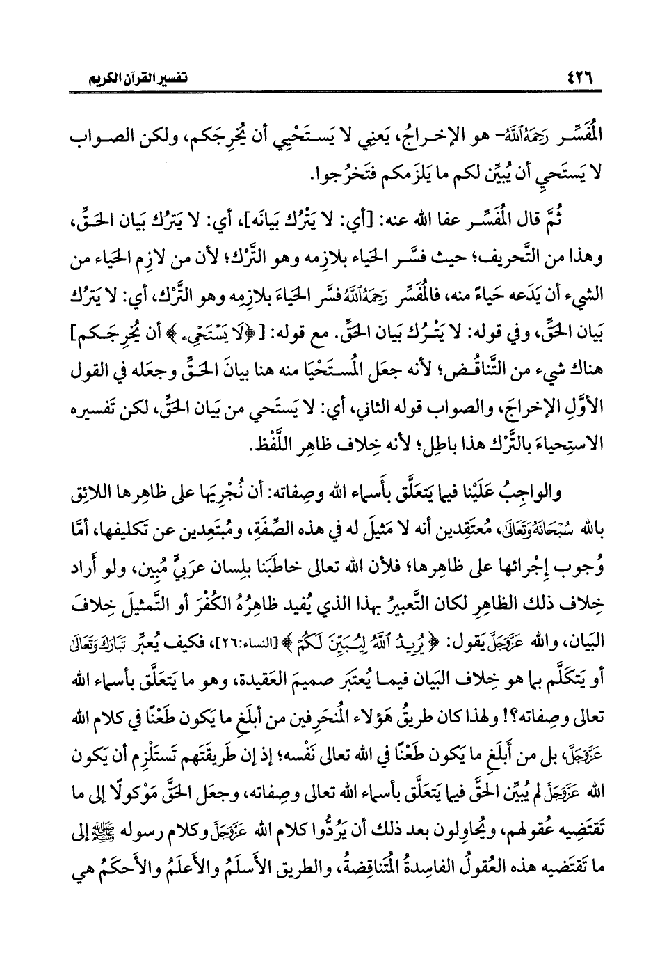 ثُمَّ قال المُفَسِّر عفا اللَّه عنه: [أي: لا يَتْرُك بَيانَه]، أي: لا يَترُك بَيان الحَقِّ، وهذا من التَّحريف؛ حيث فسَّر الحَياء بلازِمه وهو التَّرْك؛ لأن من لازِم الحَياء من الشيء أن يَدَعه حَياءً منه، فالمُفَسِّر رَحِمَهُ اللَّهُ فسَّر الحَياءَ بلازِمِه وهو التَّرْك، أي: لا يَترُك بَيان الحَقِّ، وفي قوله: لا يَتْرُك بَيان الحَقِّ. مع قوله: [{لَا يَسْتَحْيِي} أن يُخرِجَكم] هناك شيء من التَّناقُض؛ لأنه جعَل المُستَحْيَا منه هنا بيانَ الحَقِّ وجعَله في القول الأوَّلِ الإخراجَ، والصواب قوله الثاني، أي: لا يَستَحي من بَيان الحَقِّ، لكن تَفسيره الاستِحياءَ بالتَّرْك هذا باطِل؛ لأنه خِلاف ظاهِر اللَّفْظ.