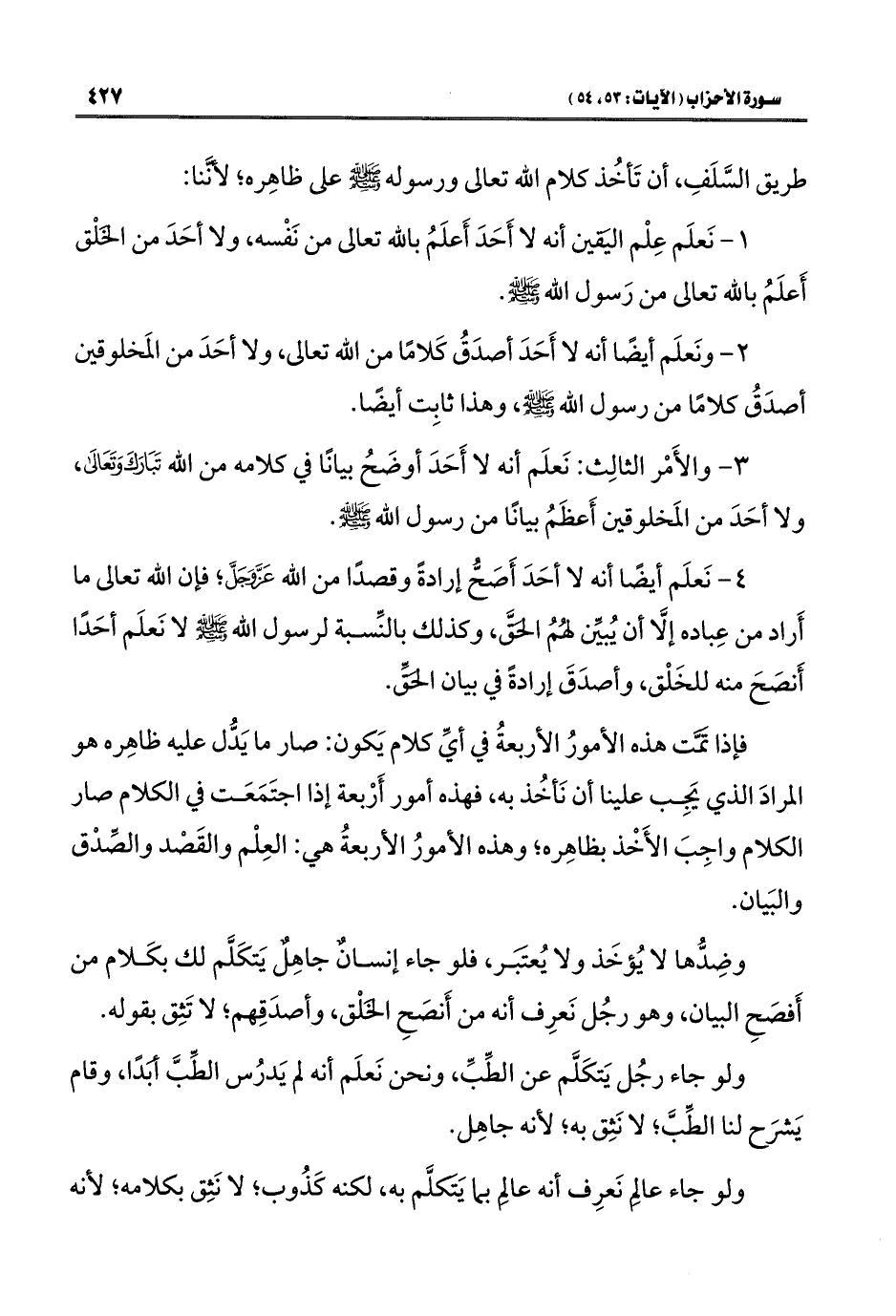فإذا تَمَّت هذه الأمورُ الأربعةُ في أيِّ كلام يَكون: صار ما يَدُّل عليه ظاهِره هو المرادَ الذي يَجِب علينا أن نَأخُذ به، فهذه أمور أَرْبعة إذا اجتَمَعَت في الكلام صار الكلام واجِبَ الأَخْذ بظاهِره؛ وهذه الأمورُ الأربعةُ هي: العِلْم والقَصْد والصِّدْق والبَيان.