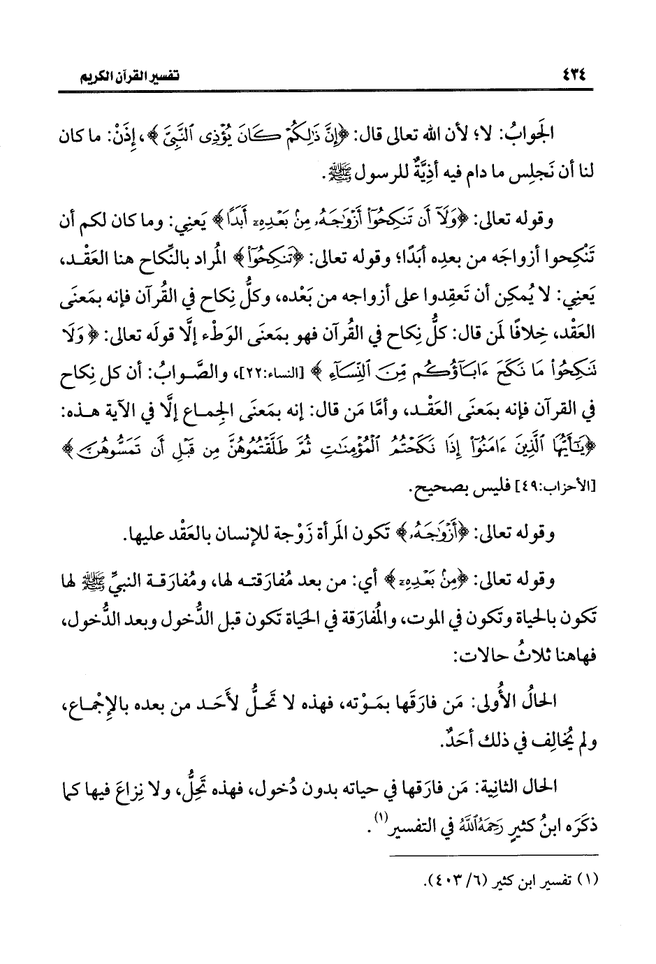 وقوله تعالى: {وَلَا أَنْ تَنْكِحُوا أَزْوَاجَهُ مِنْ بَعْدِهِ أَبَدًا} يَعنِي: وما كان لكم أن تَنْكِحوا أزواجَه من بعدِه أبَدًا؛ وقوله تعالى: {تَنْكِحُوا} المُراد بالنِّكاح هنا العَقْد، يَعنِي: لا يُمكِن أن تَعقِدوا على أزواجه من بَعْده، وكلُّ نِكاح في القُرآن فإنه بمَعنَى العَقْد، خِلافًا لمَن قال: كلُّ نِكاح في القُرآن فهو بمَعنَى الوَطْء إلَّا قولَه تعالى: {وَلَا تَنْكِحُوا مَا نَكَحَ آبَاؤُكُمْ مِنَ النِّسَاءِ} [النساء: ٢٢]، والصَّوابُ: أن كل نِكاح في القرآن فإنه بمَعنَى العَقْد، وأمَّا مَن قال: إنه بمَعنَى الجِماع إلَّا في الآية هذه: {يَاأَيُّهَا الَّذِينَ آمَنُوا إِذَا نَكَحْتُمُ الْمُؤْمِنَاتِ ثُمَّ طَلَّقْتُمُوهُنَّ مِنْ قَبْلِ أَنْ تَمَسُّوهُنَّ} [الأحزاب: ٤٩] فليس بصحيح.