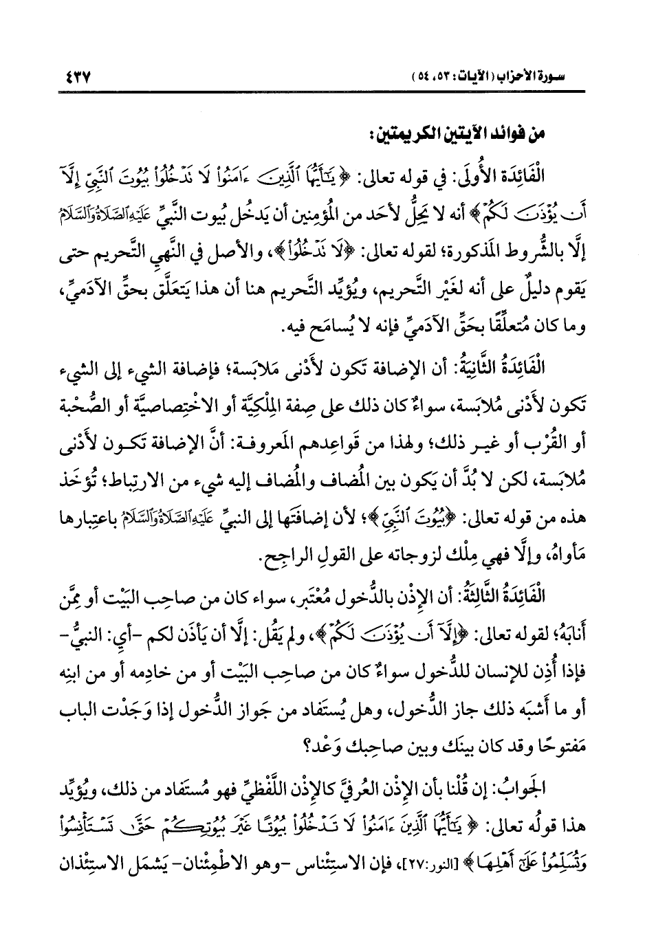 الْفَائِدَة الأُولَى: في قوله تعالى: {يَاأَيُّهَا الَّذِينَ آمَنُوا لَا تَدْخُلُوا بُيُوتَ النَّبِيِّ إِلَّا أَنْ يُؤْذَنَ لَكُمْ} أنه لا يَحِلُّ لأحَد من المُؤمِنين أن يَدخُل بُيوت النَّبيِّ عَلَيْهِ الصَّلَاةُ وَالسَّلَامُ إلَّا بالشُّروط المَذكورة؛ لقوله تعالى: {لَا تَدْخُلُوا}، والأصل في النَّهي التَّحريم حتى يَقوم دليلٌ على أنه لغَيْر التَّحريم، ويُؤيِّد التَّحريم هنا أن هذا يَتعَلَّق بحقِّ الآدَميِّ، وما كان مُتعلِّقًا بحَقِّ الآدَميِّ فإنه لا يُسامَح فيه.