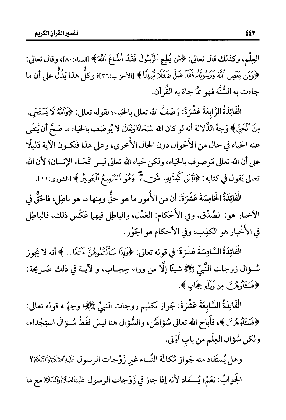 الْفَائِدَةُ السَّابِعَةَ عَشْرَةَ: جَواز تَكليم زوجات النبيِّ -صلى اللَّه عليه وسلم-؛ وجهُه قوله تعالى: {فَاسْأَلُوهُنَّ}، فأَباح اللَّه تعالى سُؤالَهُن، والسُّؤال هنا ليسَ فقَطْ سُؤالَ استِجْداء، ولكن سُؤال العِلْم من بابِ أَوْلى.