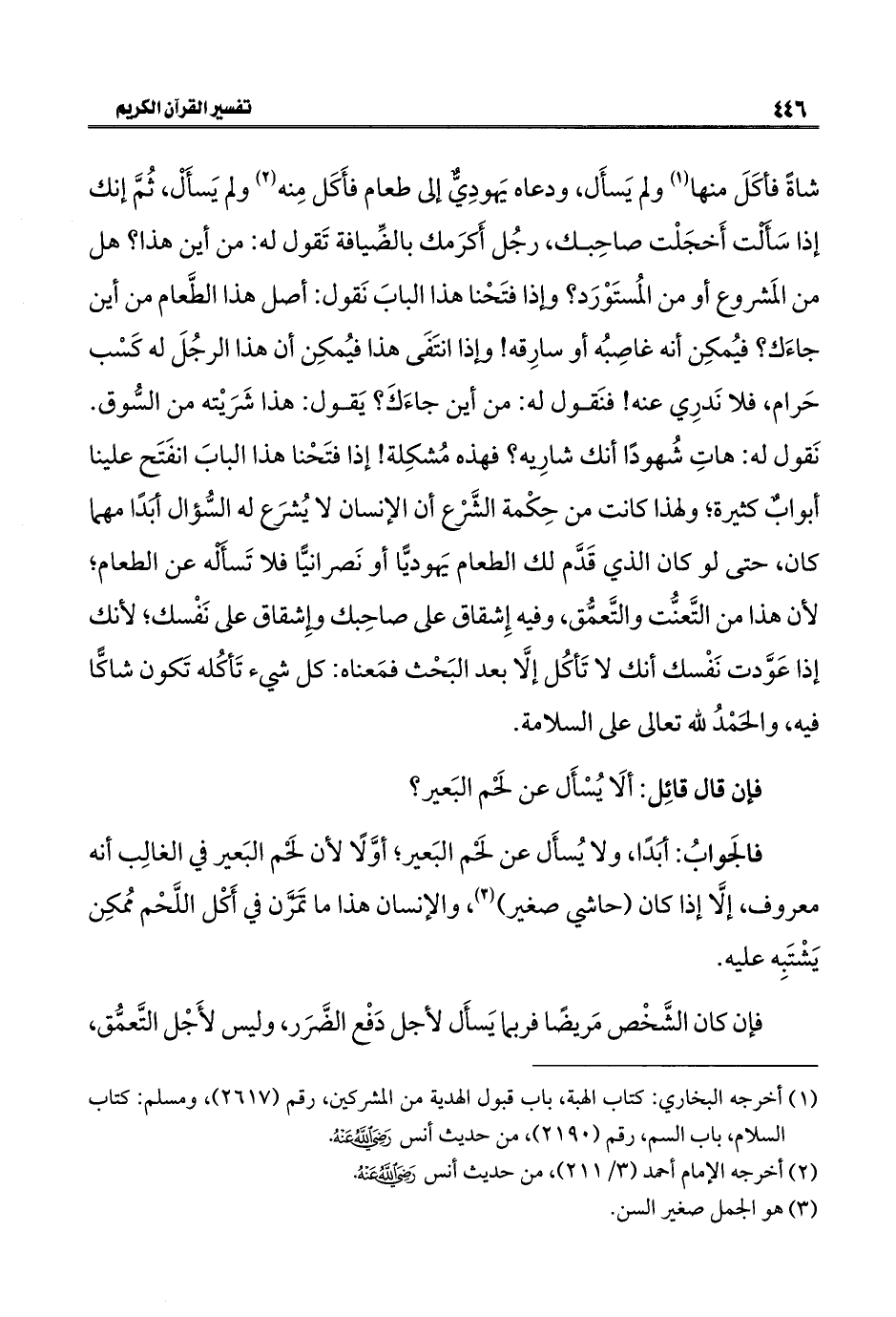 شاةً فأكَلَ منها (¬١) ولم يَسأَل، ودعاه يَهودِيٌّ إلى طعام فأَكَل مِنه (¬٢) ولم يَسأَلْ، ثُمَّ إنك إذا سَأَلْت أَخجَلْت صاحِبك، رجُل أَكرَمك بالضِّيافة تَقول له: من أين هذا؟ هل من المَشروع أو من المُستَوْرَد؟ وإذا فتَحْنا هذا البابَ نَقول: أصل هذا الطَّعام من أين جاءَك؟ فيُمكِن أنه غاصِبُه أو سارِقه! وإذا انتَفَى هذا فيُمكِن أن هذا الرجُلَ له كَسْب حَرام، فلا نَدرِي عنه! فنَقول له: من أين جاءَكَ؟ يَقول: هذا شَرَيْته من السُّوق. نَقول له: هاتِ شُهودًا أنك شارِيه؟ فهذه مُشكِلة! إذا فتَحْنا هذا البابَ انفَتَح علينا أبوابٌ كثيرة؛ ولهذا كانت من حِكْمة الشَّرْع أن الإنسان لا يُشرَع له السُّؤال أبَدًا مهما كان، حتى لو كان الذي قَدَّم لك الطعام يَهوديًّا أو نَصرانيًّا فلا تَسأَلْه عن الطعام؛ لأن هذا من التَّعنُّت والتَّعمُّق، وفيه إِشقاق على صاحِبك وإِشقاق على نَفْسك؛ لأنك إذا عَوَّدت نَفْسك أنك لا تَأكُل إلَّا بعد البَحْث فمَعناه: كل شيء تَأكُله تَكون شاكًّا فيه، والحَمْدُ للَّه تعالى على السلامة.