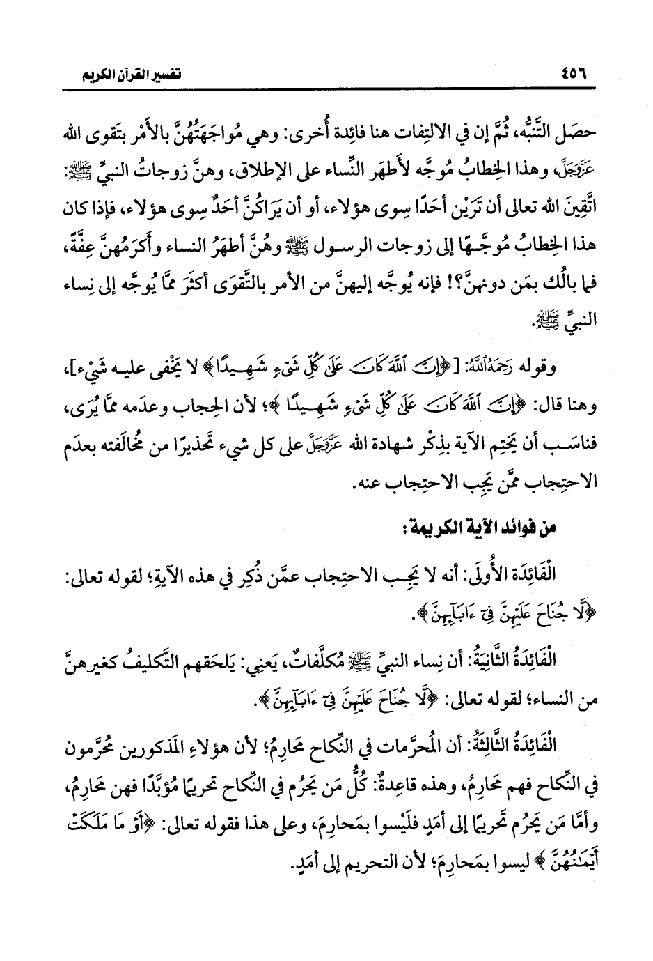 وقوله رَحِمَهُ اللَّهُ: [{إِنَّ اللَّهَ كَانَ عَلَى كُلِّ شَيْءٍ شَهِيدًا} لا يَخْفى عليه شَيْء]، وهنا قال: {إِنَّ اللَّهَ كَانَ عَلَى كُلِّ شَيْءٍ شَهِيدًا}؛ لأن الحِجاب وعدَمه ممَّا يُرَى، فناسَب أن يَختِم الآية بذِكْر شهادة اللَّه عَزَّ وَجَلَّ على كل شيء تَحذيرًا من مُخالَفته بعدَم الاحتِجاب ممَّن يَجِب الاحتِجاب عنه.