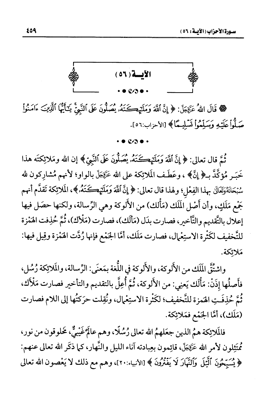 ثُمَّ قال تعالى: {إِنَّ اللَّهَ وَمَلَائِكَتَهُ يُصَلُّونَ عَلَى النَّبِيِّ} إن اللَّه ومَلائِكتَه هذا خَبَر مُؤكَّدَّ بـ {إِنَّ}، وعَطَف المَلائِكة على اللَّه عَزَّ وَجَلَّ بالواو؛ لأنهم مُشارِكون للَّه سُبْحَانَهُ وَتَعَالَى بهذا الفِعْلِ؛ ولهذا قال تعالى: {إِنَّ اللَّهَ وَمَلَائِكَتَهُ}، المَلائِكة تَقدَّم أنهم جَمْع مَلَكٍ، وأن أَصْل المَلَك (مَأْلك) من الأَلوكة وهي الرِّسالة، ولكنها حصَل فيها إعلال بالتَّقديم والتَّأخير، فصارت بدَل (مَألَك)، فصارت (مَلْأك)، ثُمَّ حُذِفت الهَمْزة للتَّخفيف لكَثْرة الاستِعْمال، فصارت مَلَك، أمَّا الجَمْع فإنها رُدَّت الهَمْزة وقِيل فيها: مَلائِكة.