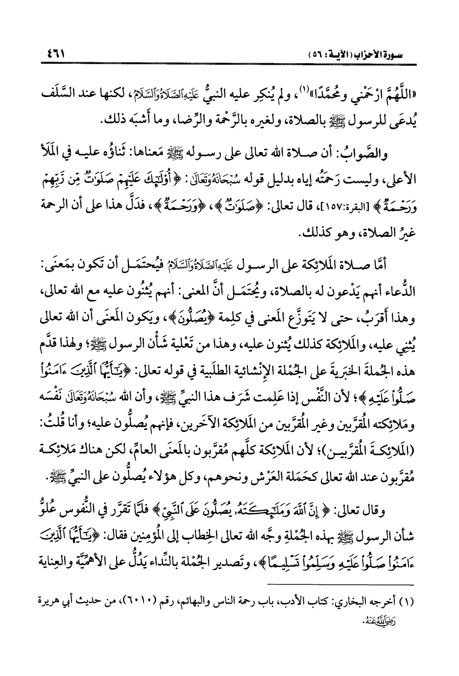 والصَّوابُ: أن صلاة اللَّه تعالى على رسوله -صلى اللَّه عليه وسلم- مَعناها: ثَناؤُه عليه في المَلَأ الأعلى، وليست رَحمَتُه إياه بدليل قوله سُبْحَانَهُ وَتَعَالَى: {أُولَئِكَ عَلَيْهِمْ صَلَوَاتٌ مِنْ رَبِّهِمْ وَرَحْمَةٌ} [البقرة: ١٥٧]، قال تعالى: {صَلَوَاتٌ}، {وَرَحْمَةٌ}، فدَلَّ هذا على أن الرحمة غيرُ الصلاة، وهو كذلك.