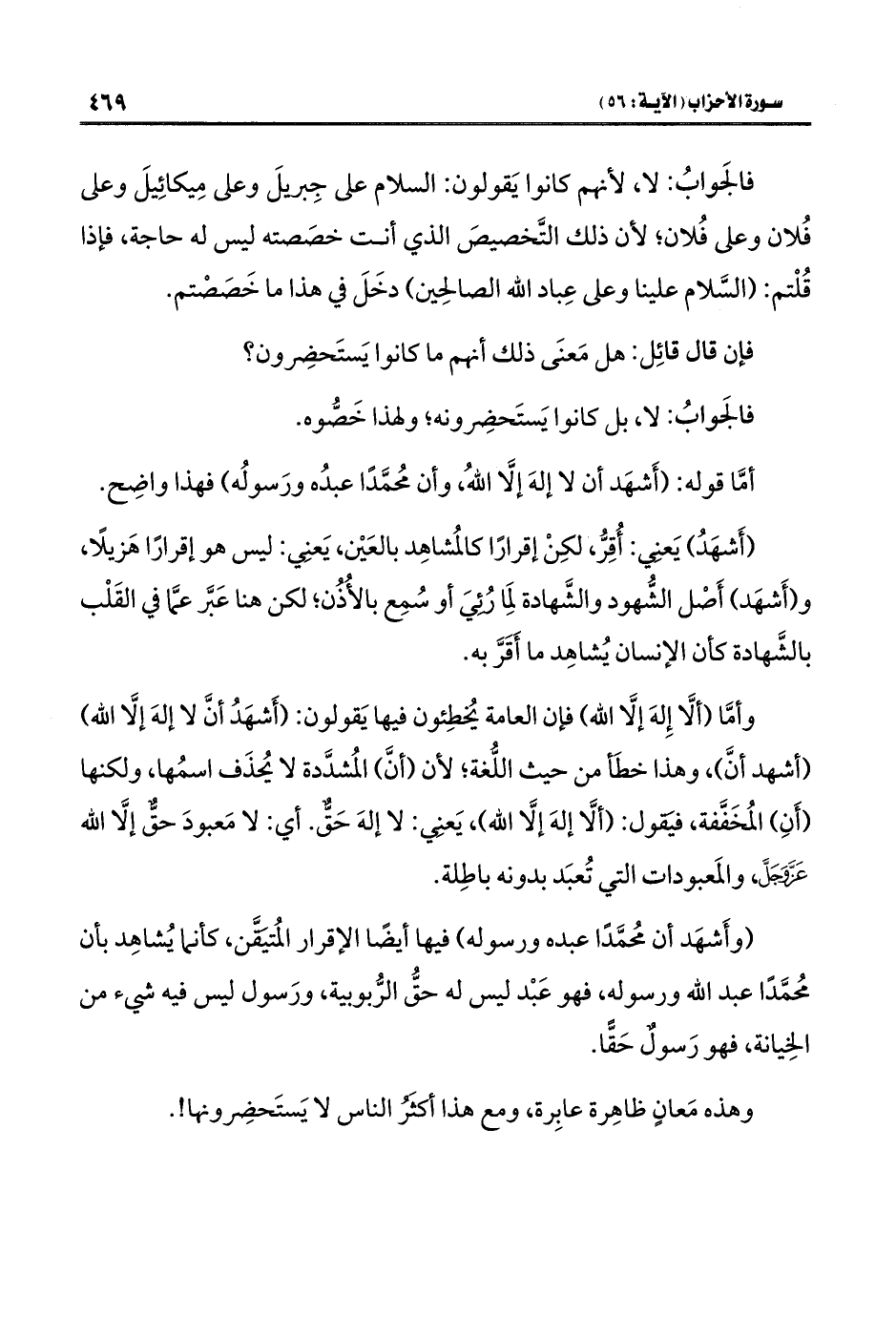 وأمَّا (ألَّا إِلهَ إلَّا اللَّه) فإن العامة يُخطِئون فيها يَقولون: (أَشهَدُ أنَّ لا إلهَ إلَّا اللَّه) (أشهد أنَّ)، وهذا خطَأ من حيث اللُّغة؛ لأن (أنَّ) المُشدَّدة لا يُحذَف اسمُها، ولكنها (أَنِ) المُخَفَّفة، فتقول: (ألَّا إلهَ إلَّا اللَّه)، يَعنِي: لا إلهَ حَقٌّ. أي: لا مَعبودَ حقٌّ إلَّا اللَّه عَزَّ وَجَلَّ، والمَعبودات التي تُعبَد بدونه باطِلة.