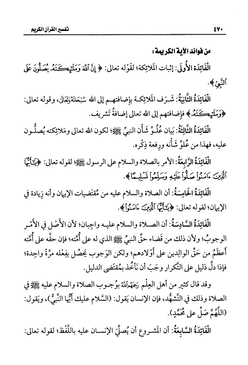الْفَائِدَة الأُولَى: إثبات المَلائِكة؛ لقَوْله تعالى: {إِنَّ اللَّهَ وَمَلَائِكَتَهُ يُصَلُّونَ عَلَى النَّبِيِّ}.