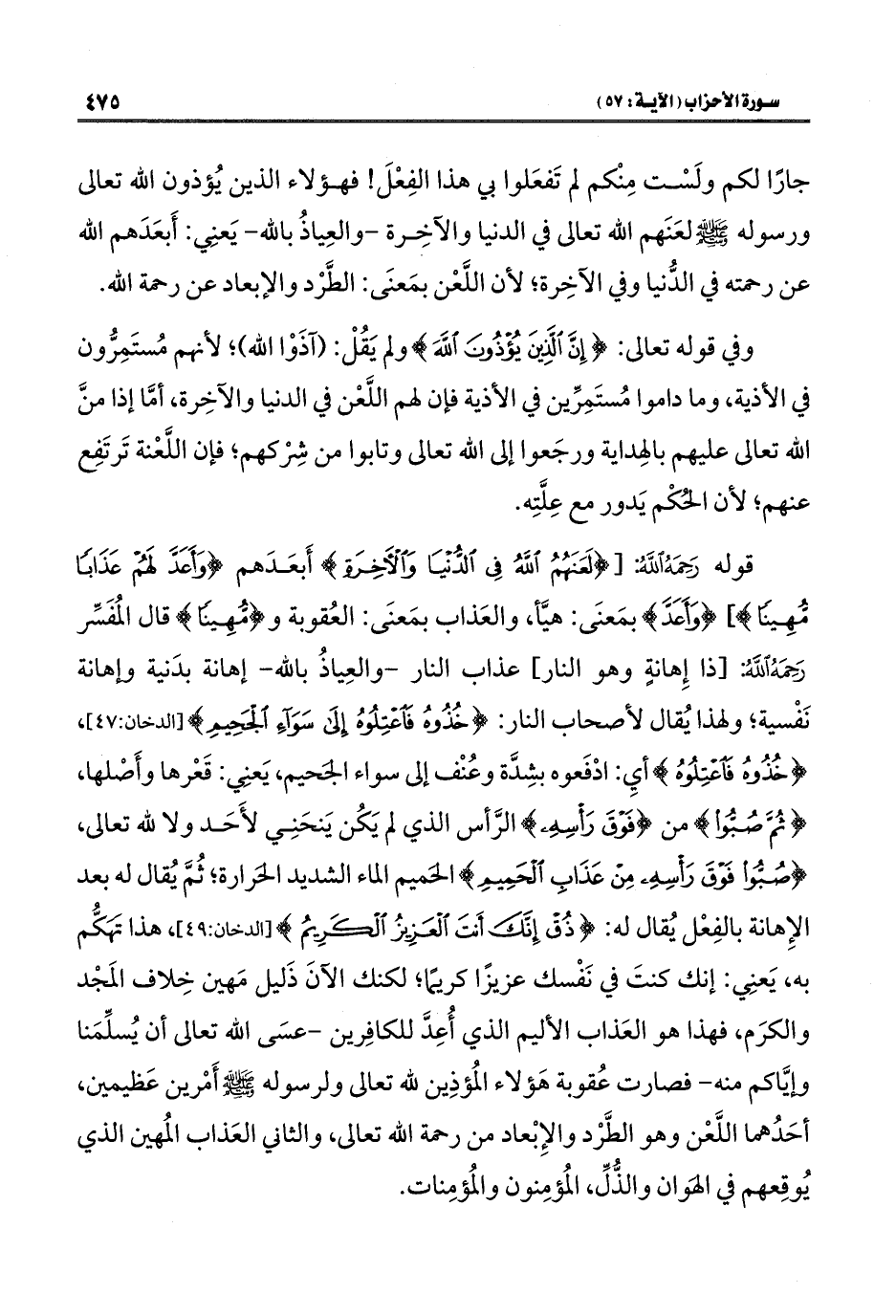 قوله رَحِمَهُ اللَّهُ: [{لَعَنَهُمُ اللَّهُ فِي الدُّنْيَا وَالْآخِرَةِ} أَبعَدَهم {وَأَعَدَّ لَهُمْ عَذَابًا مُهِينًا}]، {وَأَعَدَّ} بمَعنَى: هيَّأ، والعَذاب بمَعنَى: العُقوبة و {مُهِينًا} قال المُفَسِّر رَحِمَهُ اللَّهُ: [ذا إِهانةٍ وهو النار] عذاب النار -والعِياذُ باللَّه- إهانة بدَنية وإهانة نَفْسية؛ ولهذا يُقال لأصحاب النار: {خُذُوهُ فَاعْتِلُوهُ إِلَى سَوَاءِ الْجَحِيمِ} [الدخان: ٤٧]، {خُذُوهُ فَاعْتِلُوهُ} أي: ادْفَعوه بشِدَّة وعُنْف إلى سواء الجَحيم، يَعنِي: قَعْرها وأَصْلها، {ثُمَّ صُبُّوا} من {فَوْقَ رَأْسِهِ} الرَّأس الذي لم يَكُن يَنحَنِي لأَحَد ولا للَّه تعالى، {صُبُّوا فَوْقَ رَأْسِهِ مِنْ عَذَابِ الْحَمِيمِ} الحَميم الماء الشديد الحَرارة؛ ثُمَّ يُقال له بعد الإِهانة بالفِعْل يُقال له: {ذُقْ إِنَّكَ أَنْتَ الْعَزِيزُ الْكَرِيمُ} [الدخان: ٤٩]، هذا تَهَكُّم به، يَعنِي: إنك كنتَ في نَفْسك عزيزًا كريمًا؛ لكنك الآنَ ذَليل مَهين خِلاف المَجْد والكرَم، فهذا هو العَذاب الأليم الذي أُعِدَّ للكافِرين -عسَى اللَّه تعالى أن يُسلِّمَنا وإيَّاكم منه- فصارت عُقوبة هَؤلاء المُؤذِين للَّه تعالى ولرسوله -صلى اللَّه عليه وسلم- أَمْرين عَظيمين، أحَدُهما اللَّعْن وهو الطَّرْد والإِبْعاد من رحمة اللَّه تعالى، والثاني العَذاب المُهين الذي يُوقِعهم في الهَوان والذُّلِّ، المُؤمِنون والمُؤمِنات.