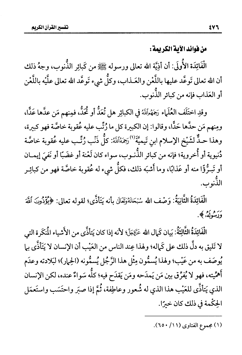 الْفَائِدَة الأُولَى: أن أذِيَّة اللَّه تعالى ورسوله -صلى اللَّه عليه وسلم- من كَبائِر الذُّنوب، وجهُ ذلك أن اللَّه تعالى تَوعَّد عليها باللَّعْن والعَذاب، وكلُّ شيء تَوعَّد اللَّه تعالى علَّيْه باللَّعْن أو العَذاب فإنه من كبائر الذُّنوب.