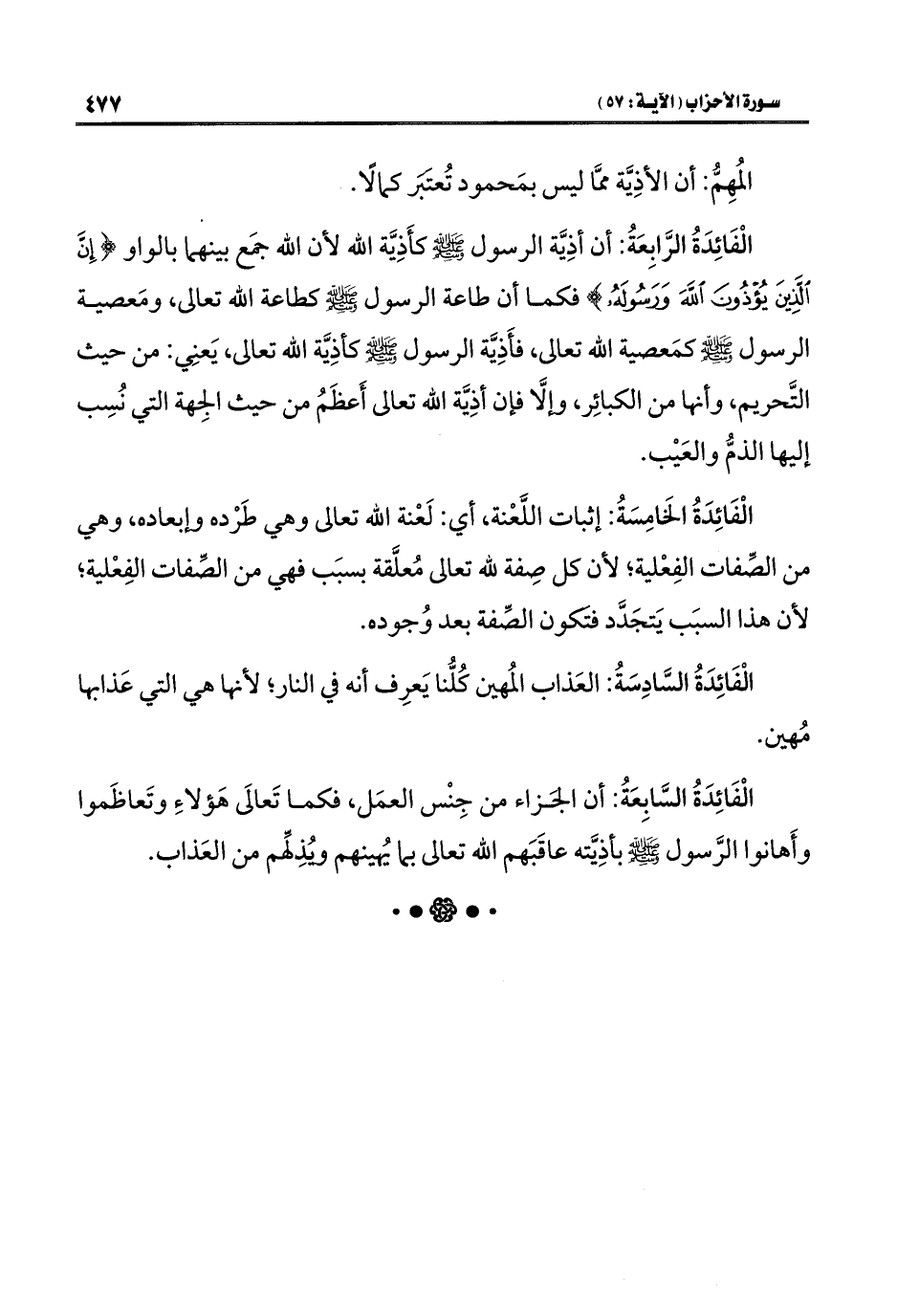 الْفَائِدَةُ الرَّابِعَةُ: أن أذِيَّة الرسول -صلى اللَّه عليه وسلم- كأَذِيَّة اللَّه لأن اللَّه جمَع بينهما بالواو {إِنَّ الَّذِينَ يُؤْذُونَ اللَّهَ وَرَسُولَهُ} فكما أن طاعة الرسول -صلى اللَّه عليه وسلم- كطاعة اللَّه تعالى، ومَعصية الرسول -صلى اللَّه عليه وسلم- كمَعصية اللَّه تعالى، فأَذِيَّة الرسول -صلى اللَّه عليه وسلم- كأذِيَّة اللَّه تعالى، يَعنِي: من حيث التَّحريم، وأنها من الكبائِر، وإلَّا فإن أذِيَّة اللَّه تعالى أَعظَمُ من حيث الجِهة التي نُسِب إليها الذمُّ والعَيْب.