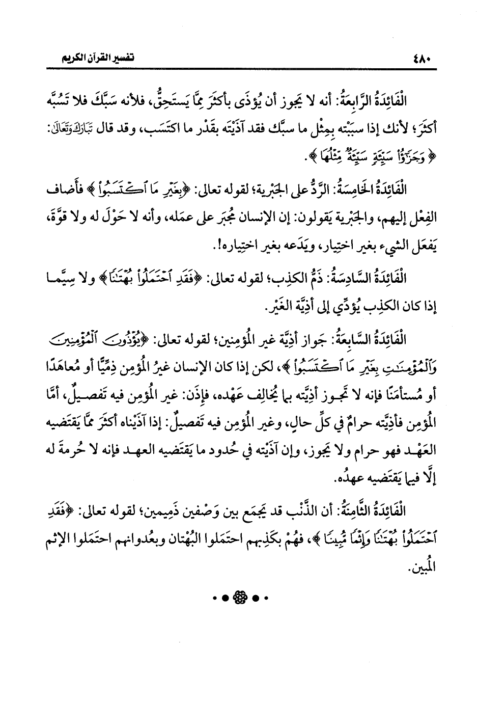 الْفَائِدَةُ الثَّامِنَةُ: أن الذَّنْب قد يَجمَع بين وَصْفين ذَمِيمين؛ لقوله تعالى: {فَقَدِ احْتَمَلُوا بُهْتَانًا وَإِثْمًا مُبِينًا}، فهُمْ بكَذِبهم احتَمَلوا البُهْتان وبعُدوانهم احتَمَلوا الإثم المُبين.