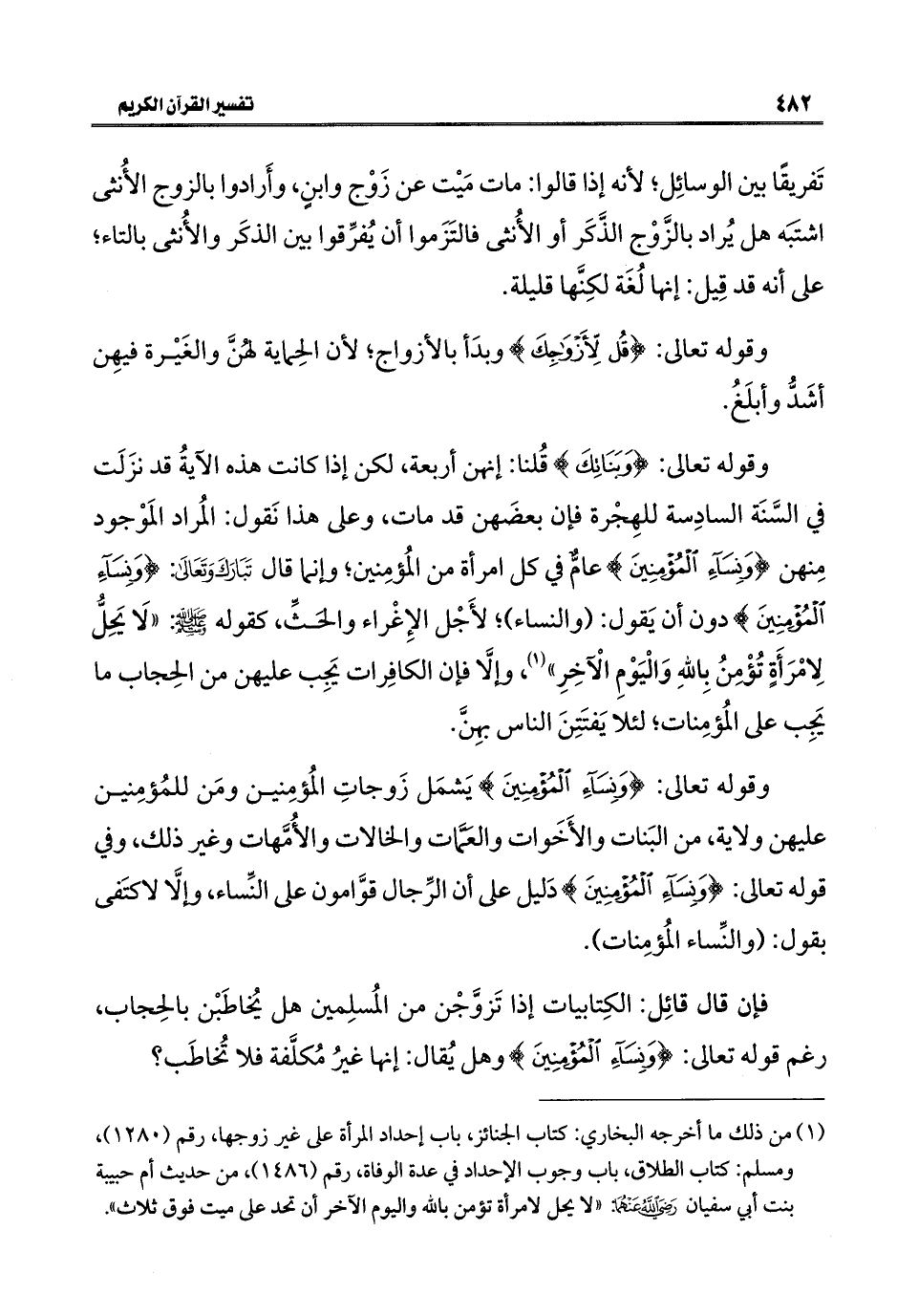 وقوله تعالى: {وَبَنَاتِكَ} قُلنا: إنهن أربعة، لكن إذا كانت هذه الآيةُ قد نزَلَت في السَّنَة السادِسة للهِجْرة فإن بعضَهن قد مات، وعلى هذا نَقول: المُراد المَوْجود مِنهن {وَنِسَاءِ الْمُؤْمِنِينَ} عامٌّ في كل امرأة من المُؤمِنين؛ وإنما قال تَبَارَكَ وَتَعَالَى: {وَنِسَاءِ الْمُؤْمِنِينَ} دون أن يَقول: (والنساء)؛ لأَجْل الإِغْراء والحَثِّ، كقوله -صلى اللَّه عليه وسلم-: "لَا يَحِلُّ لِامْرَأَةٍ تُؤْمِنُ بِاللهِ وَالْيَوْمِ الْآخِرِ" (¬١)، وإلَّا فإن الكافِرات يَجِب عليهن من الحِجاب ما يَجِب على المُؤمِنات؛ لئلا يَفتَتِنَ الناس بهِنَّ.