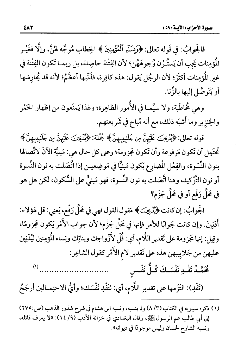 قوله تعالى: {يُدْنِينَ عَلَيْهِنَّ مِنْ جَلَابِيبِهِنَّ} جُمْلة: {يُدْنِينَ عَلَيْهِنَّ مِنْ جَلَابِيبِهِنَّ} تَحتَمِل أن تَكون مَرفوعة وأن تَكون مَجزومة؛ وعلى كل حال هي: مَبنيَّة الآنَ لاتِّصالها بنون النِّسْوة، والفِعْل المُضارِع يَكون مَبنيًّا في مَوضِعين إذا اتَّصَلت به نون النِّسوة أو نون التَّوْكيد، وهنا اتَّصَلت به نون النِّسوة، فهو مَبنيٌّ على السُّكون، لكن هل هو في مَحلِّ رَفْع أو في مَحلِّ جَزْم؟
