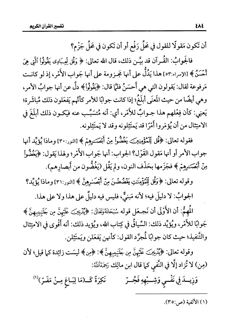 المُهِمُّ: أن الأَوْلَى أن نَجعَل قوله سُبْحَانَهُ وَتَعَالَى: {يُدْنِينَ عَلَيْهِنَّ مِنْ جَلَابِيبِهِنَّ} جَوابًا للأَمْر، ويُؤيِّد ذلك: السِّياقُ في كِتاب اللَّه، ويُؤيد ذلك: أنه أَقْوى في الامتِثال والتَّنفيذ؛ حيث كان جوابًا لمُجرَّد القول: كأنهن يَفعَلن ويَمتَثِلن.