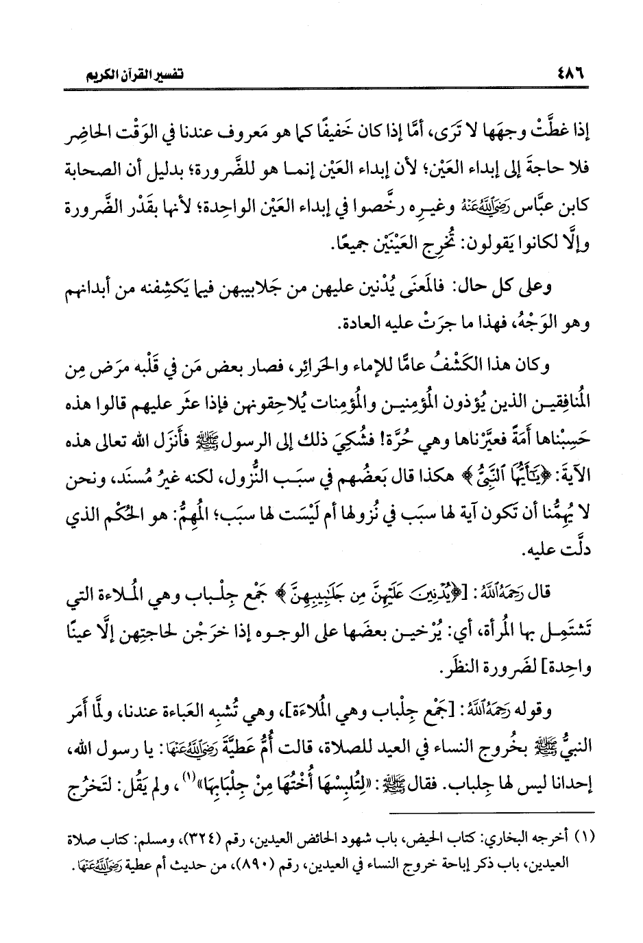 قال رَحِمَهُ اللَّهُ: [{يُدْنِينَ عَلَيْهِنَّ مِنْ جَلَابِيبِهِنَّ} جَمْع جِلْباب وهي المُلاءة التي تَشتَمِل بها المُرأة، أي: يُرْخين بعضَها على الوجوه إذا خرَجْن لحاجتِهن إلَّا عينًا واحِدة] لضَرورة النظَر.