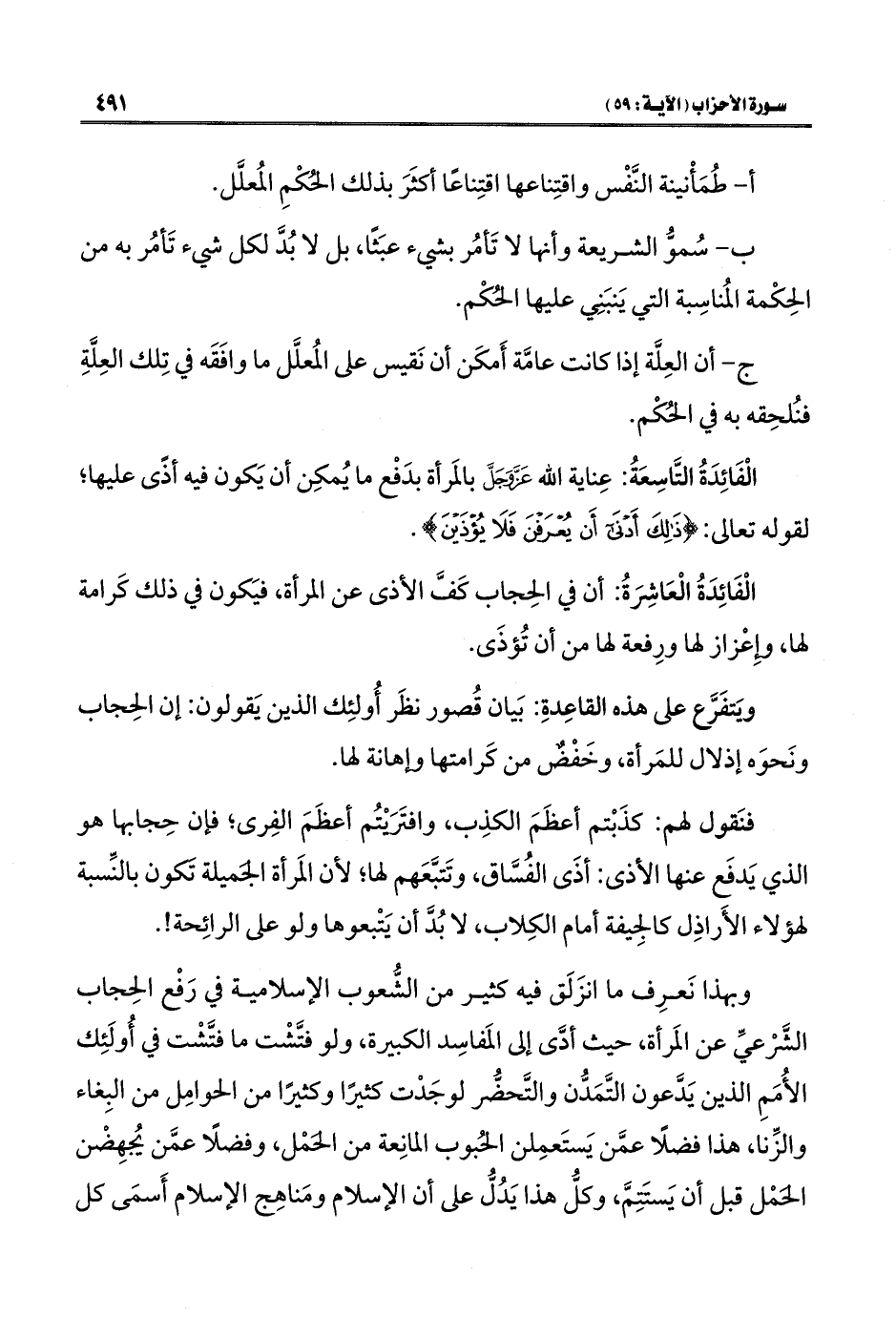 الْفَائِدَةُ الْعَاشِرَةُ: أن في الحِجاب كَفَّ الأذى عن المرأة، فيَكون في ذلك كَرامة لها، وإِعْزاز لها ورِفعة لها من أن تُؤذَى.