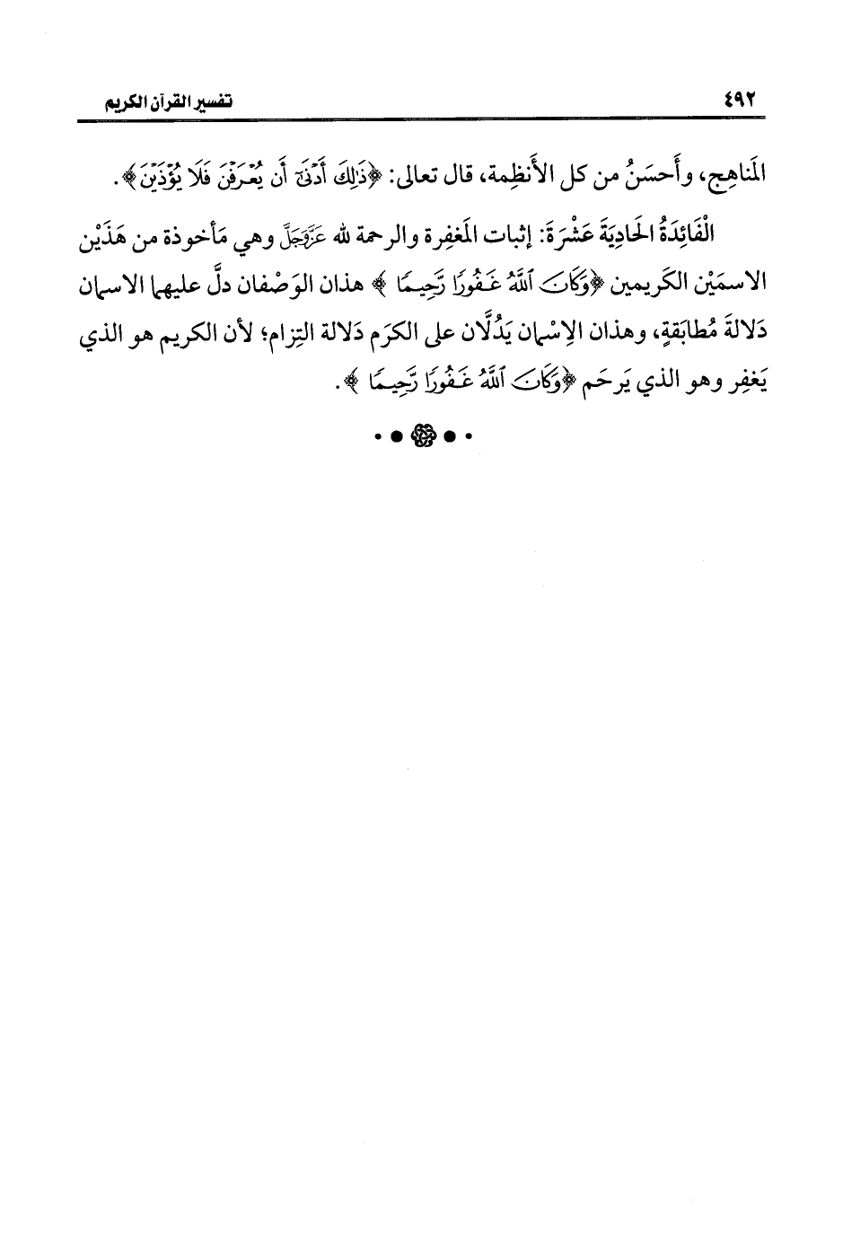الْفَائِدَةُ الحَادِيَةَ عَشْرَةَ: إثبات المَغفِرة والرحمة للَّه عَزَّ وَجَلَّ وهي مَأخوذة من هَذَيْن الاسمَيْن الكَريمين {وَكَانَ اللَّهُ غَفُورًا رَحِيمًا} هذان الوَصْفان دلَّ عليهما الاسمان دَلالةَ مُطابَقةٍ، وهذان الِاسْمان يَدُلَّان على الكرَم دَلالة التِزام؛ لأن الكريم هو الذي يَغفِر وهو الذي يَرحَم {وَكَانَ اللَّهُ غَفُورًا رَحِيمًا}.
