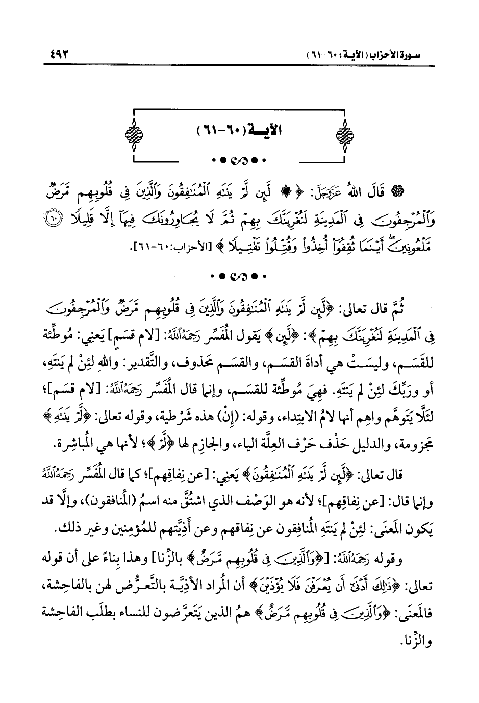 ثُمَّ قال تعالى: {لَئِنْ لَمْ يَنْتَهِ الْمُنَافِقُونَ وَالَّذِينَ فِي قُلُوبِهِمْ مَرَضٌ وَالْمُرْجِفُونَ فِي الْمَدِينَةِ لَنُغْرِيَنَّكَ بِهِمْ}: {لَئِنْ} يَقول المُفَسِّر رَحِمَهُ اللَّهُ: [لام قسَمٍ] يَعنِي: مُوطِّئة للقَسَم، وليسَتْ هي أداةَ القسَم، والقسَم محَذوف، والتَّقدير: واللَّهِ لئِنْ لم يَنتَهِ، أو ورَبِّكَ لئِنْ لم يَنتَهِ. فهِيَ مُوطِّئة للقسَم، وإنما قال المُفَسِّر رَحِمَهُ اللَّهُ: [لام قسَم]؛ لئَلَّا يَتَوهَّم واهِم أنها لامُ الابتِداء، وقوله: (إِنْ) هذه شَرْطية، وقوله تعالى: {لَمْ يَنْتَهِ} مجَزومة، والدليل حَذْف حَرْف العِلَّة الياء، والجازِم لها {لَمْ}؛ لأنها هي المُباشِرة.