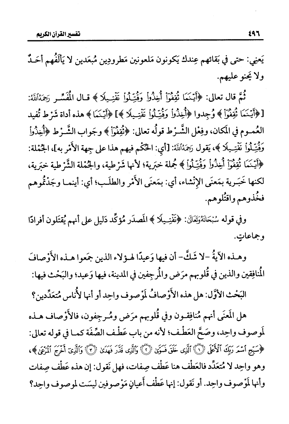 ثُمَّ قال تعالى: {أَيْنَمَا ثُقِفُوا أُخِذُوا وَقُتِّلُوا تَقْتِيلًا} قال المُفَسِّر رَحِمَهُ اللَّهُ: [{أَيْنَمَا ثُقِفُوا} وُجِدوا {أُخِذُوا وَقُتِّلُوا تَقْتِيلًا}]، {أَيْنَمَا} هذه أداة شَرْط تُفيد العُموم في المَكان، وفِعْل الشَّرْط قولُه تعالى: {ثُقِفُوا} وجَواب الشَّرْط {أُخِذُوا وَقُتِّلُوا تَقْتِيلًا}، يَقول رَحِمَهُ اللَّهُ: [أي: الحُكْم فيهم هذا على جِهة الأَمْر به]، الجُمْلة: {أَيْنَمَا ثُقِفُوا أُخِذُوا وَقُتِّلُوا} جُملة خبَرية؛ لأنها شرْطية، والجُمْلة الشَّرْطية خبَرية، لكنها خَبَرية بمَعنَى الإِنْشاء، أي: بمَعنَى الأَمْر والطلَب؛ أي: أينما وجَدْتمُوهم فخُذوهم واقتُلوهم.