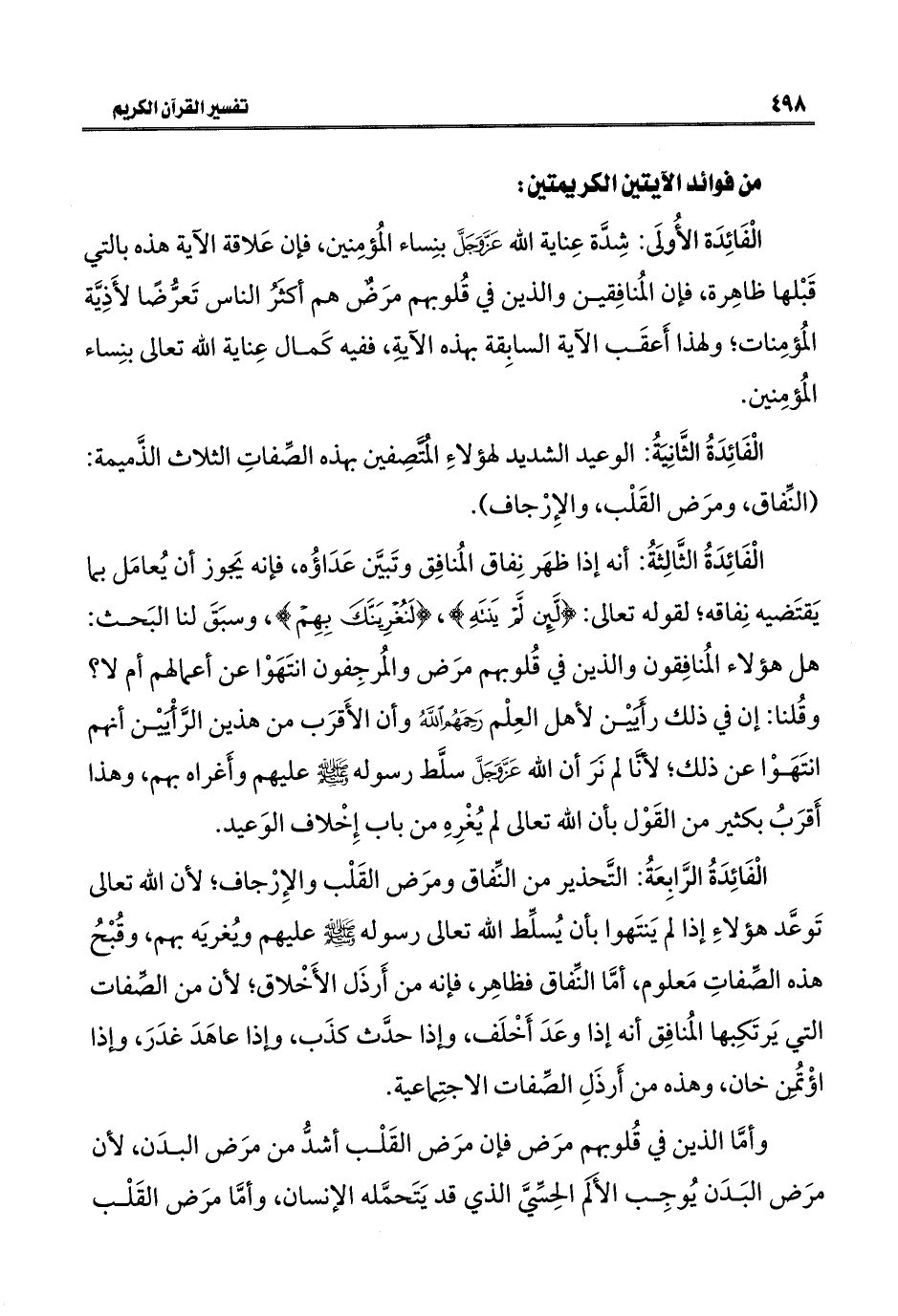 الْفَائِدَةُ الرَّابِعَةُ: التَّحذير من النِّفاق ومرَض القَلْب والإِرْجاف؛ لأن اللَّه تعالى تَوعَّد هؤلاءِ إذا لم يَنتَهوا بأن يُسلِّط اللَّه تعالى رسوله -صلى اللَّه عليه وسلم- عليهم ويُغريَه بهم، وقُبْحُ هذه الصِّفاتِ مَعلوم، أمَّا النِّفاق فظاهِر، فإنه من أَرذَل الأَخْلاق؛ لأن من الصِّفات التي يَرتَكِبها المُنافِق أنه إذا وعَدَ أَخْلَف، وإذا حدَّث كذَب، وإذا عاهَدَ غدَرَ، وإذا اؤْتُمِن خان، وهذه من أَرذَلِ الصِّفات الاجتِماعية.