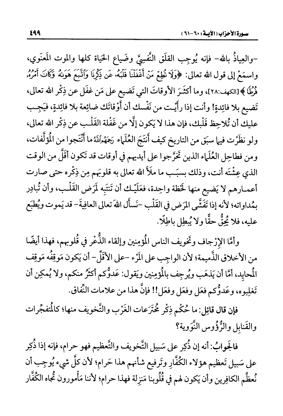 -والعِياذُ باللَّه- فإنه يُوجِب القلَق النَّفسِيَّ وضَياع الحَياة كلها والموت المَعنَوي، واسمَعْ إلى قول اللَّه تعالى: {وَلَا تُطِعْ مَنْ أَغْفَلْنَا قَلْبَهُ عَنْ ذِكْرِنَا وَاتَّبَعَ هَوَاهُ وَكَانَ أَمْرُهُ فُرُطًا} [الكهف: ٢٨]، وما أكثَرَ الأوقاتَ التي تَضيع على مَن غفَل عن ذِكْر اللَّه تعالى، تَضيع بلا فائِدةٍ! وأنت إذا رأَيْت من نَفْسك أن أَوْقاتَك ضائِعة بلا فائِدةٍ، فيَجِب عليك أن تُلاحِظ قَلْبك، فإن هذا لا يَكون إلَّا من غَفْلة القَلْب عن ذِكْر اللَّه تعالى، ولو نظَرْت فيما سبَق من التاريخ كيف أَنتَجَ العُلَماء رَحِمَهُم اللَّهُ ما أَنْتَجوا من المُؤلَّفات، ومن فطاحِل العُلَماء الذين تَخرَّجوا على أيديهم في أوقات قد تَكون أقَلَّ من الوقت الذي عِشْتَه أنت، وذلك بسبَب ما ملَأَ اللَّه تعالى به قلوبَهم مِن ذِكْره حتى صارت أعمارهم لا يَضيع منها لَحْظة واحِدة، فعَلَيْك أن تَنتَبِه لمَرَض القَلْب، وأن تُبادِر بمُداواته؛ لأنه إذا تَفَشَّى المرَض في القَلْب -نَسأَل اللَّهَ تعالى العافِيةَ- قد يَموت ويُطبَع عليه، فلا يُحِقُّ حقًّا ولا يُبطِل باطِلًا.