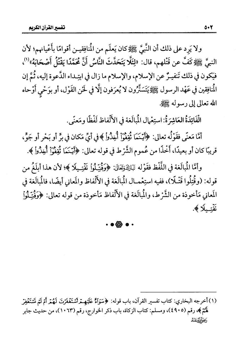 (¬١) أخرجه البخاري: كتاب تفسير القرآن، باب قوله: {سَوَاءٌ عَلَيْهِمْ أَسْتَغْفَرْتَ لَهُمْ أَمْ لَمْ تَسْتَغْفِرْ لَهُمْ}، رقم (٤٩٠٥)، ومسلم: كتاب الزكاة، باب ذكر الخوارج، رقم (١٠٦٣)، من حديث جابر -رضي اللَّه عنه-.