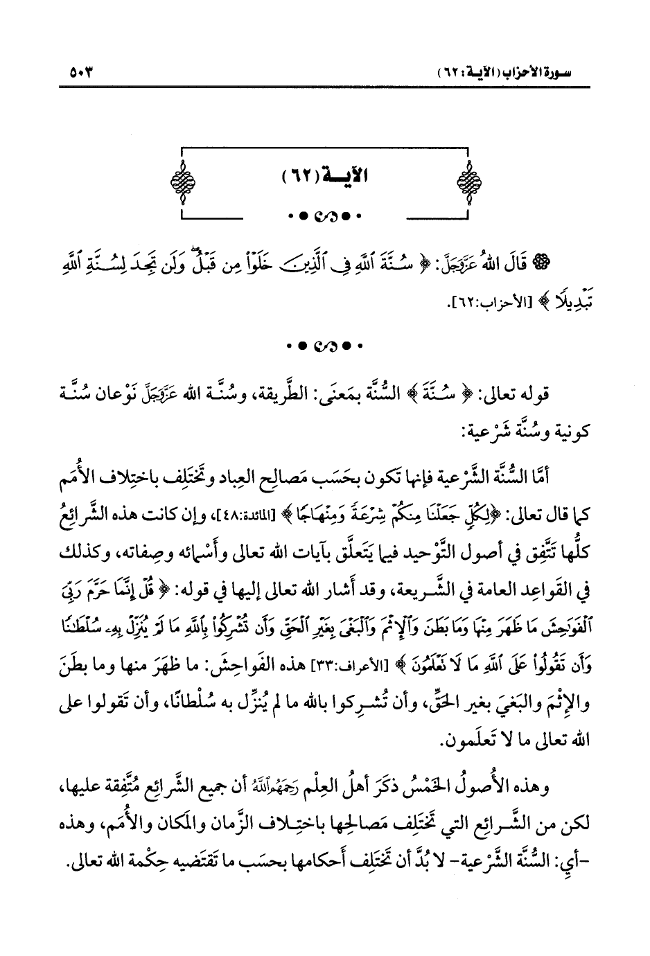 أمَّا السُّنَّة الشَّرْعية فإنها تَكون بحَسَب مَصالِح العِباد وتَختَلِف باختِلاف الأُمَم كما قال تعالى: {لِكُلٍّ جَعَلْنَا مِنْكُمْ شِرْعَةً وَمِنْهَاجًا} [المائدة: ٤٨]، وإن كانت هذه الشَّرائِعُ كلُّها تَتَّفِق في أصول التَّوْحيد فيما يَتَعلَّق بآيات اللَّه تعالى وأَسْمائه وصِفاته، وكذلك في القَواعِد العامة في الشَّريعة، وقد أَشار اللَّه تعالى إليها في قوله: {قُلْ إِنَّمَا حَرَّمَ رَبِّيَ الْفَوَاحِشَ مَا ظَهَرَ مِنْهَا وَمَا بَطَنَ وَالْإِثْمَ وَالْبَغْيَ بِغَيْرِ الْحَقِّ وَأَنْ تُشْرِكُوا بِاللَّهِ مَا لَمْ يُنَزِّلْ بِهِ سُلْطَانًا وَأَنْ تَقُولُوا عَلَى اللَّهِ مَا لَا تَعْلَمُونَ} [الأعراف: ٣٣] هذه الفَواحِشَ: ما ظهَرَ منها وما بطَنَ والإِثْمَ والبَغيَ بغير الحَقِّ، وأن تُشرِكوا باللَّه ما لم يُنزِّل به سُلْطانًا، وأن تَقولوا على اللَّه تعالى ما لا تَعلَمون.