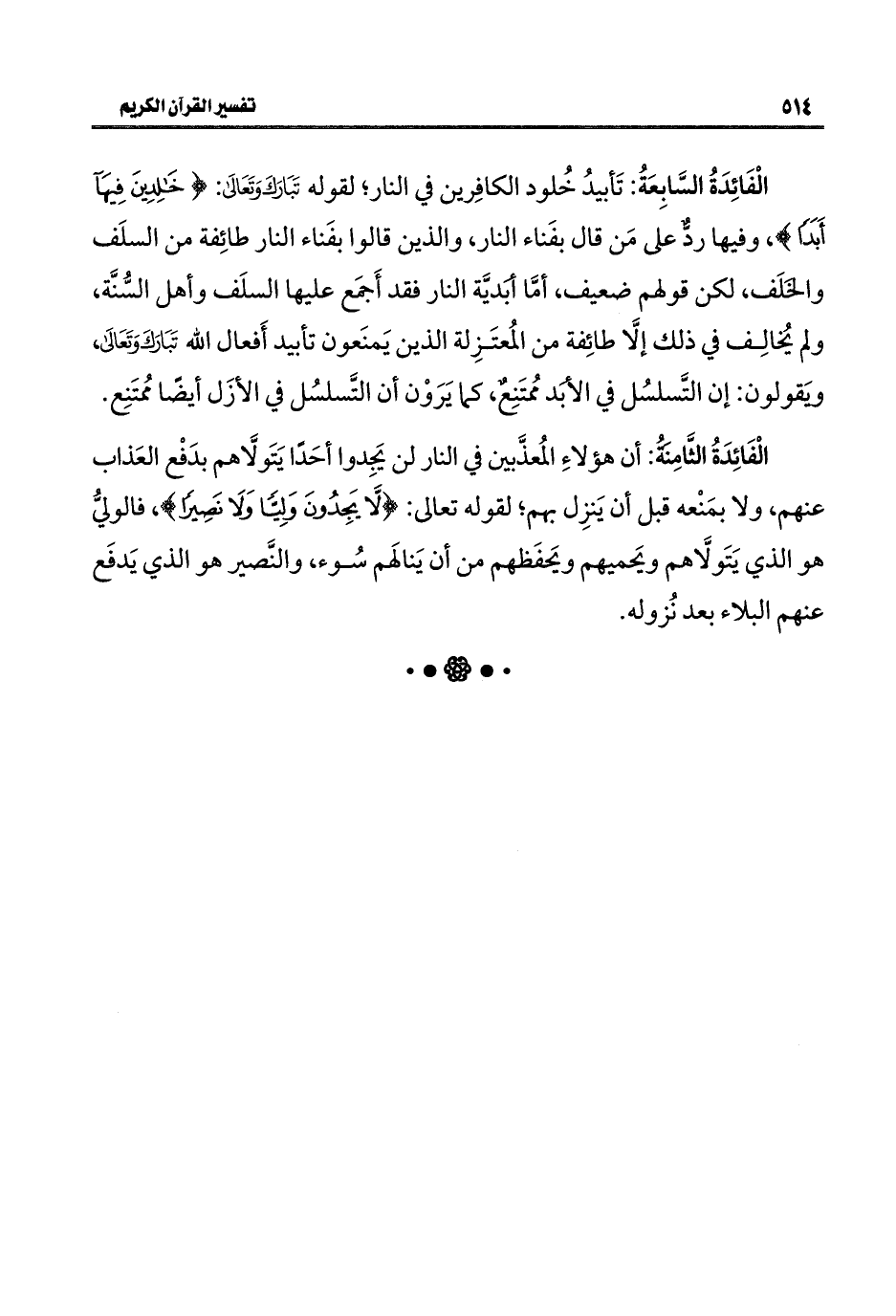 الْفَائِدَةُ السَّابِعَةُ: تَأبيدُ خُلود الكافِرين في النار؛ لقوله تَبَارَكَ وَتَعَالَى: {خَالِدِينَ فِيهَا أَبَدًا}، وفيها ردٌّ على مَن قال بفَناء النار، والذين قالوا بفَناء النار طائِفة من السلَف والخَلَف، لكن قولهم ضعيف، أمَّا أبَديَّة النار فقد أَجمَع عليها السلَف وأهل السُّنَّة، ولم يُخالِف في ذلك إلَّا طائِفة من المُعتَزِلة الذين يَمنَعون تأبيد أَفعال اللَّه تَبَارَكَ وَتَعَالَى، ويَقولون: إن التَّسلسُل في الأبَد مُمتَنِعٌ، كما يَرَوْن أن التَّسلسُل في الأزَل أيضًا مُمتَنِع.