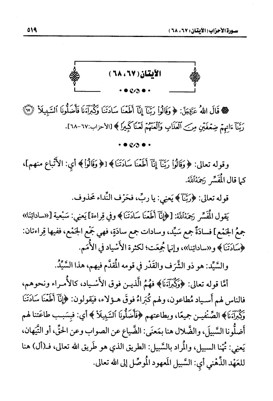 يَقول المُفَسِّر رَحِمَهُ اللَّهُ: [{إِنَّا أَطَعْنَا سَادَتَنَا} وفي قِراءة] يَعنِي: سَبْعية ["ساداتنَا" جمعُ الجَمْع] فسادَةٌ جمع سَيِّد، وسادات جمع سادَةٍ، فهي جَمْع الجَمْع، ففيها قِراءتان: {سَادَتَنَا} و"ساداتِنا"، وإنما جُمِعَت؛ لكثرة الأَسْياد في الأُمَم.