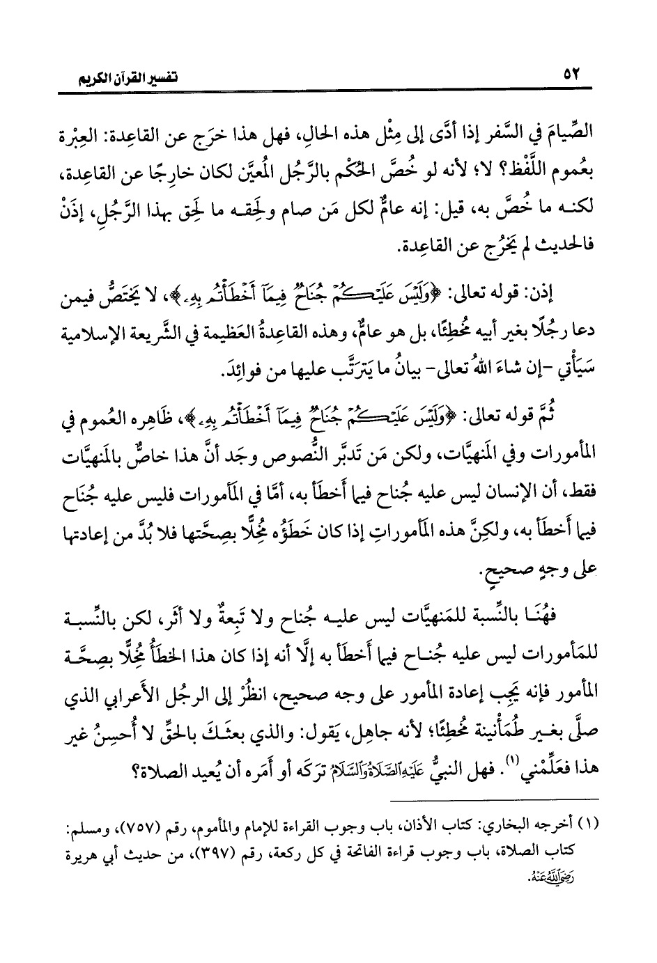 ثُمَّ قوله تعالى: {وَلَيْسَ عَلَيْكُمْ جُنَاحٌ فِيمَا أَخْطَأْتُمْ بِهِ}، ظَاهِره العُموم في المأمورات وفي المَنهيَّات، ولكن مَن تَدبَّر النُّصوص وجَد أن هذا خاصٌّ بالمَنهيَّات فقط، أن الإنسان ليس عليه جُناح فيما أَخطَأ به، أمَّا في المأمورات فليس عليه جُنَاح فيما أَخطَأ به، ولكِنَّ هذه المَأموراتِ إذا كان خَطَؤُه مخُلًّا بصِحَّتها فلا بُدَّ من إعادتها على وجهٍ صحيحٍ.