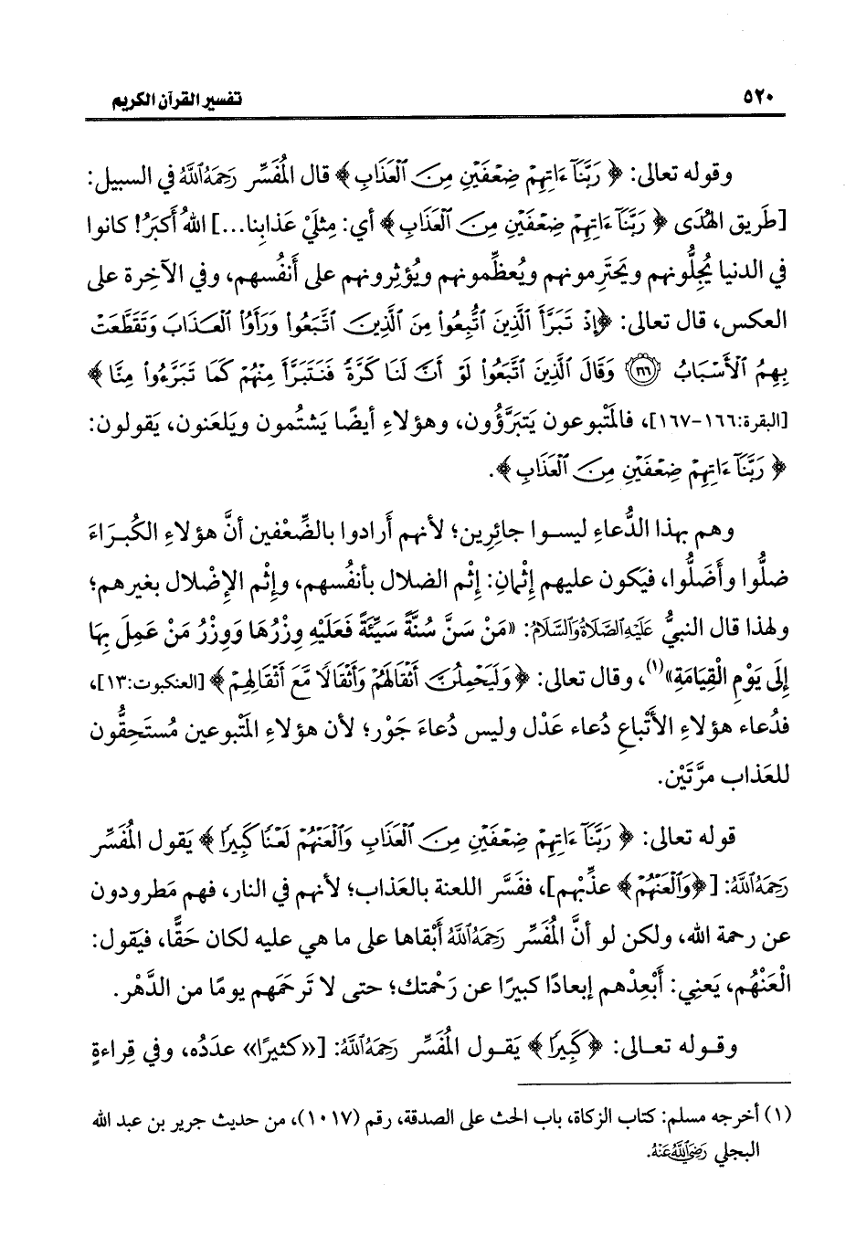 قوله تعالى: {رَبَّنَا آتِهِمْ ضِعْفَيْنِ مِنَ الْعَذَابِ وَالْعَنْهُمْ لَعْنًا كَبِيرًا} يَقول المُفَسِّر رَحِمَهُ اللَّهُ: [{وَالْعَنْهُمْ} عذِّبْهم]، ففَسَّر اللعنة بالعَذاب، لأنهم في النار، فهم مَطرودون عن رحمة اللَّه، ولكن لو أنَّ المُفَسِّر رَحِمَهُ اللَّهُ أَبْقاها على ما هي عليه لكان حَقًّا، فتقول: الْعَنْهُم، يَعنِي: أَبْعِدْهم إبعادًا كبيرًا عن رَحْمتك؛ حتى لا تَرحَمَهم يومًا من الدَّهْر.